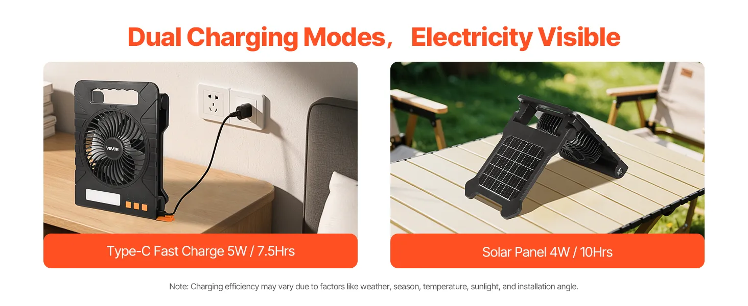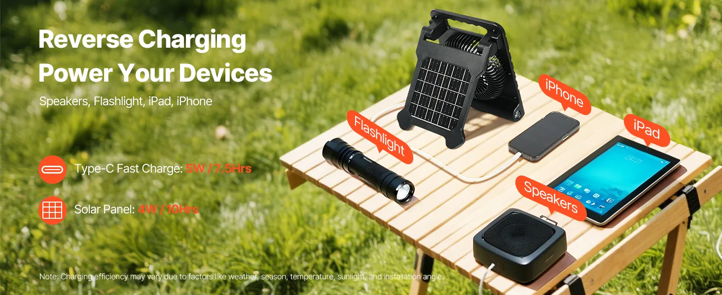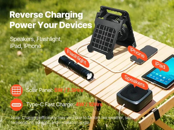 Designed for outdoor adventures, this solar fan provides long-lasting battery life, multiple speed settings for quick cooling, and quiet operation for a peaceful experience. It supports reverse charging and includes an LED light. Ideal for camping, fishing, picnics, and more!