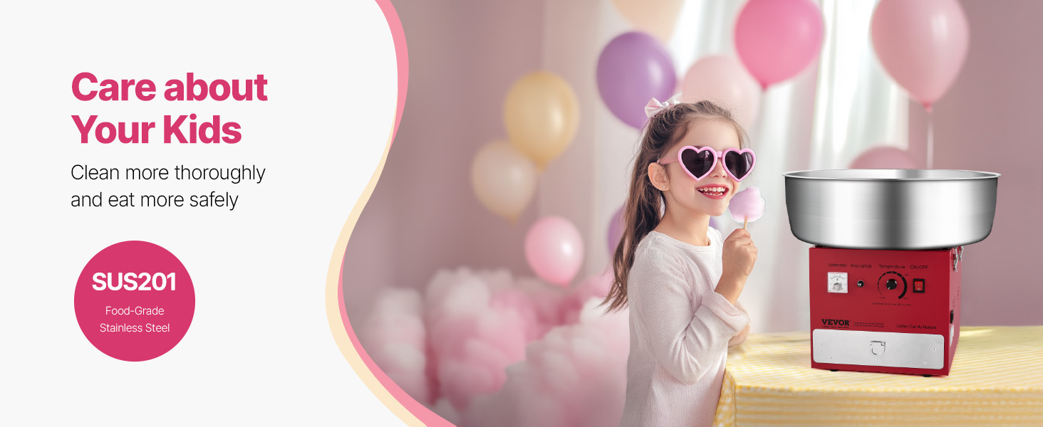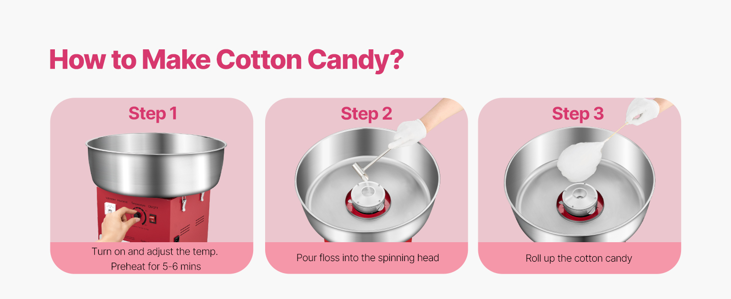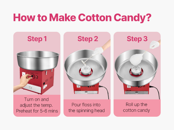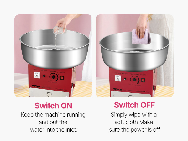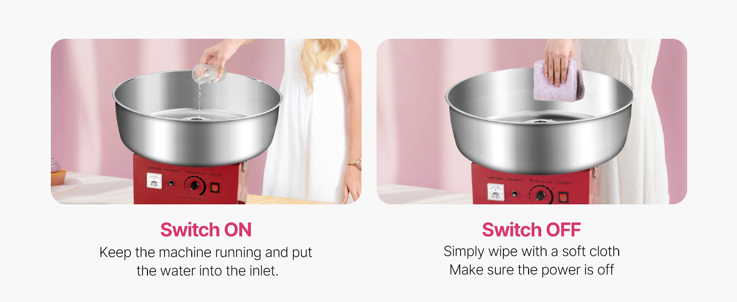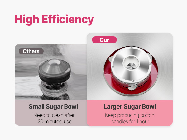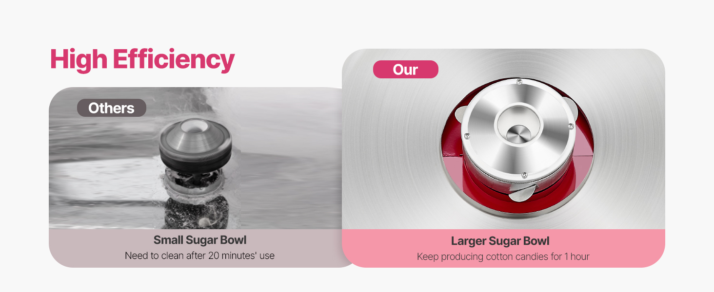 Эта машина для приготовления сахарной ваты оснащена двигателем мощностью 1000 Вт и конфетницей большего размера, производящей максимум 6 сахарных ват в минуту. Эта машина делает приготовление сахарной ваты более эффективным и легким.