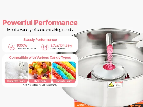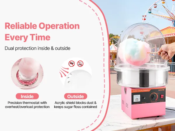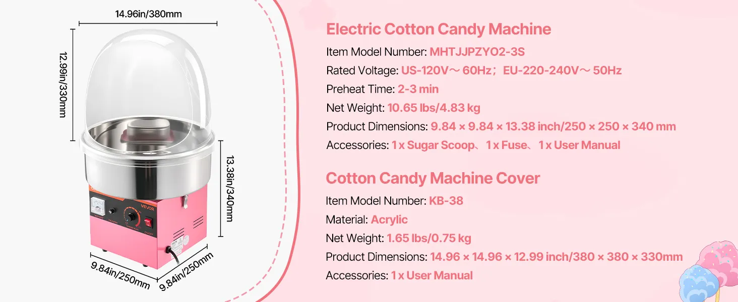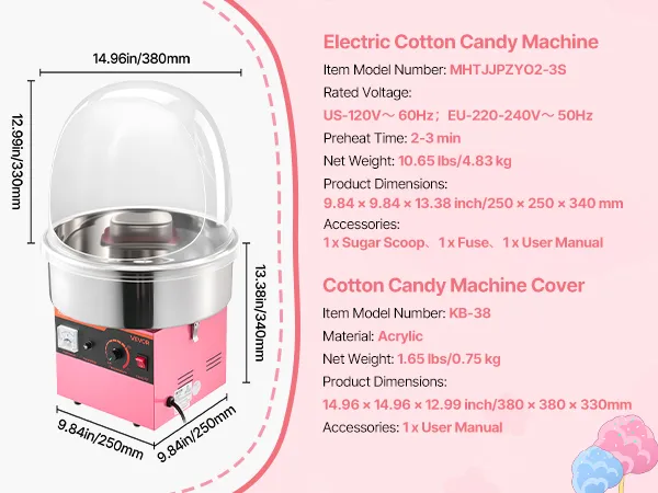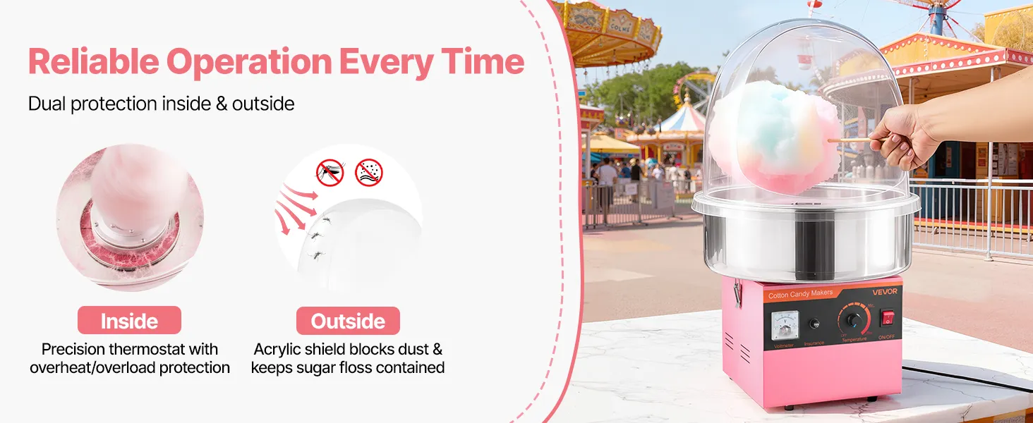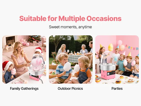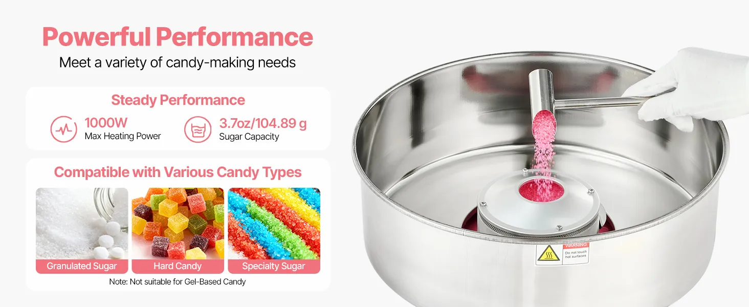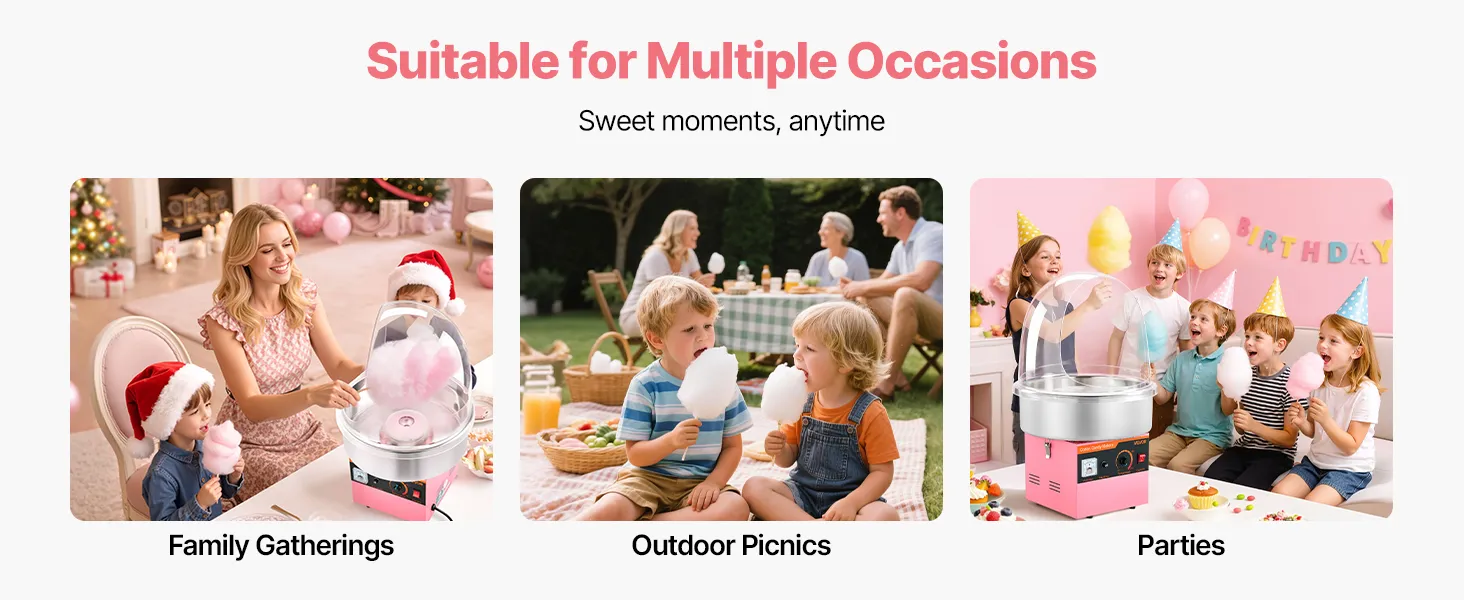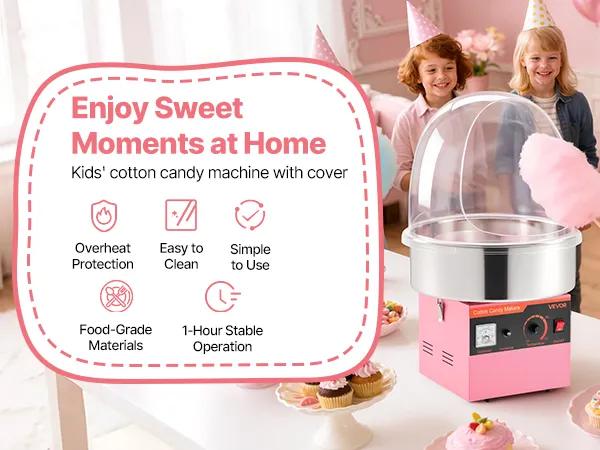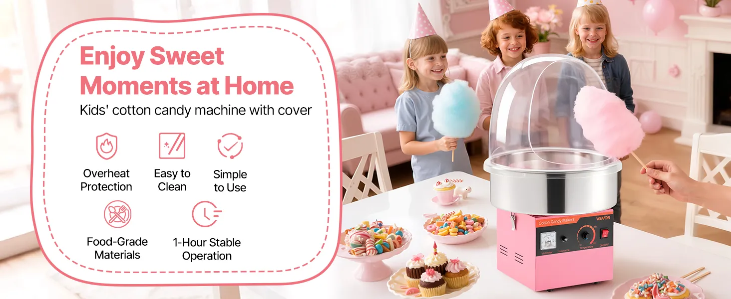 Enjoy cotton candy anytime with this VEVOR lid-equipped cotton candy machine. Great for birthdays, festive events, backyard parties, or candy shops, it makes serving sweet treats engaging and fun, creating joyful memories for family, friends, and guests alike.