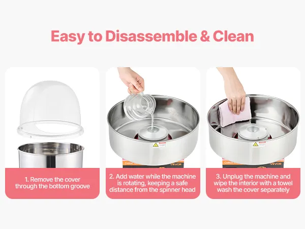 Clean-up is easy with this commercial cotton candy machine. The lid's recessed design allows simple removal. Rinse the sugar bowl while spinning to clear away leftover sugar, then unplug and wipe the interior and lid to keep the machine tidy and ready for delicious cotton candy every time.