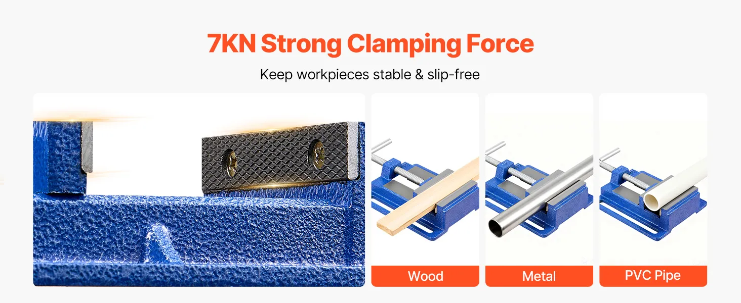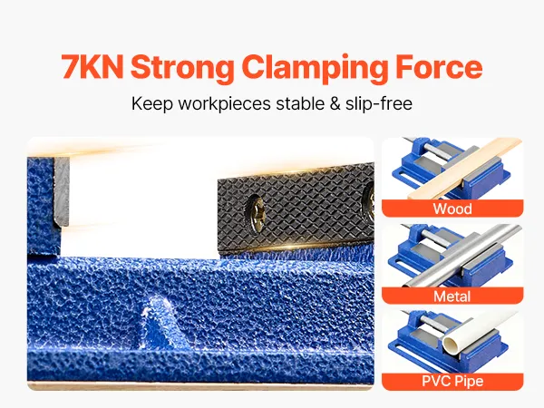 Delivers up to 7 KN of powerful clamping force, the machinist vise ensures secure fixation of wood, metal, and PVC pipes.