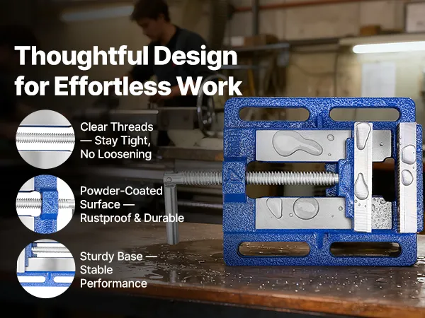 Our cast iron drill press vise features clear threads that stay tight and resist loosening, ensuring steady clamping. The sturdy base provides stability during operation, enabling a secure and reliable working experience.
