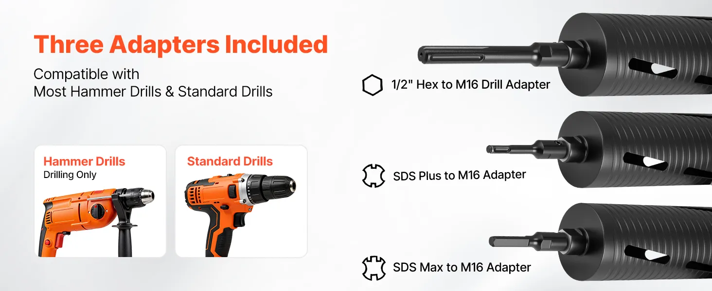 Our diamond dry coring bit includes three adapters for easy compatibility with SDS Plus, SDS Max, and 1/2 in hex drill bits. No need for additional purchases—this set handles all your drilling needs.