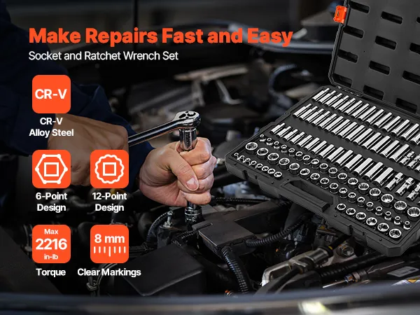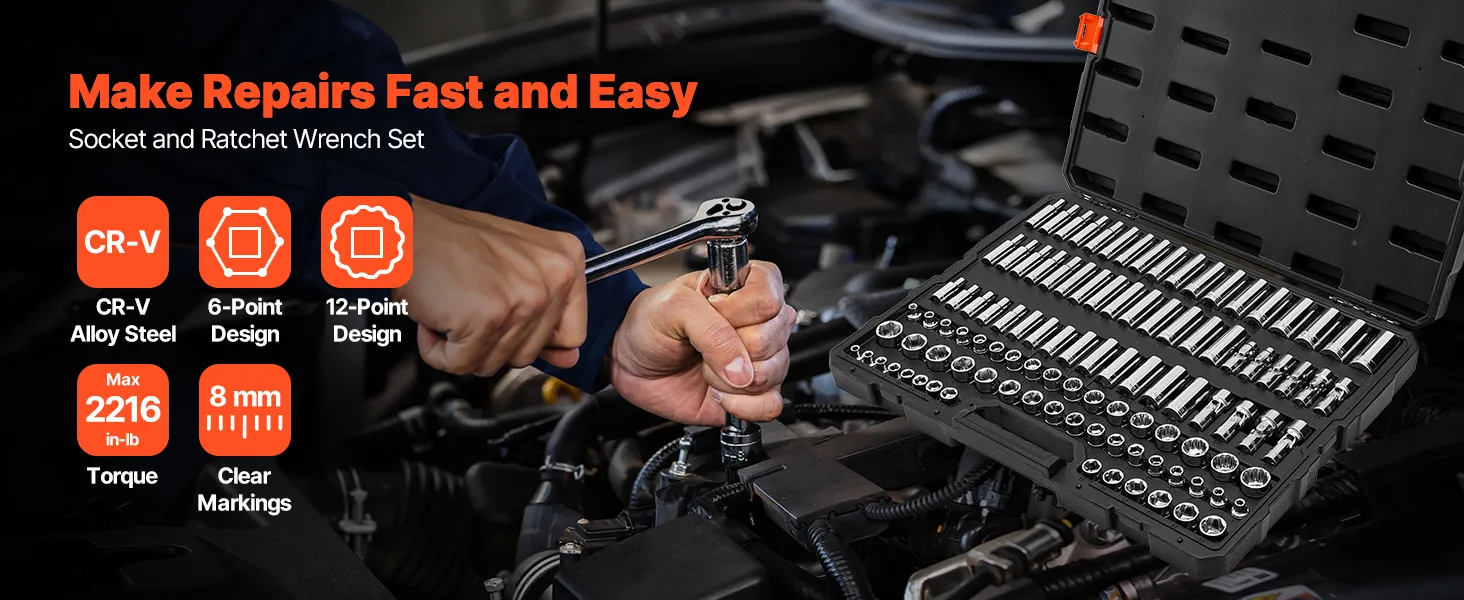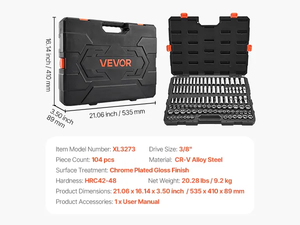 VEVOR Socket Set, 104 Pieces, 9.5 mm Drive Socket Tool Set, Metric Size from 6 to 24 mm, Deep and Standard, Mechanic Tool Kit with Storage Case, Chrome Plated CR-V Alloy Steel, for Automotive Repair