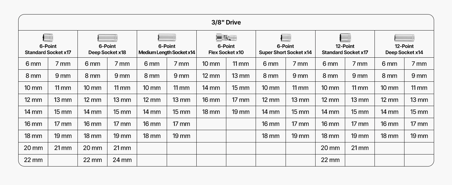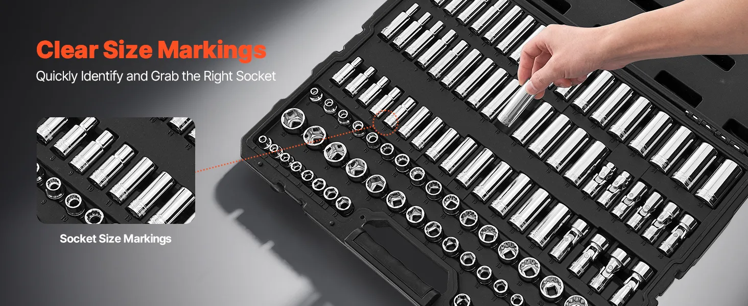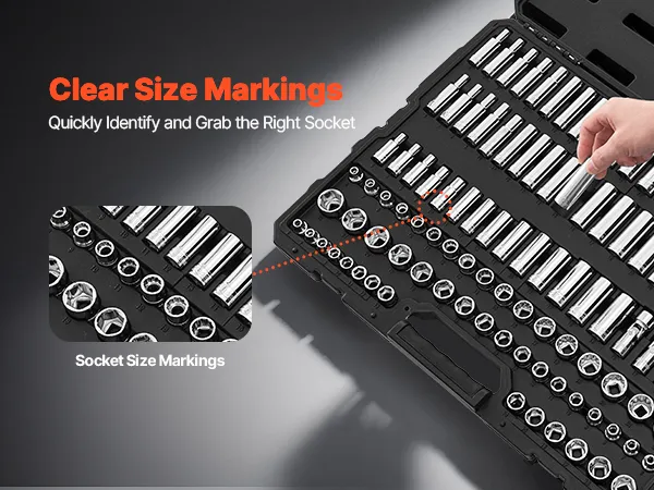 Each socket features engraved, easy-to-read size markings that are highly wear-resistant. This socket tool set ensures quick identification and faster access to the right tool when you need it.
