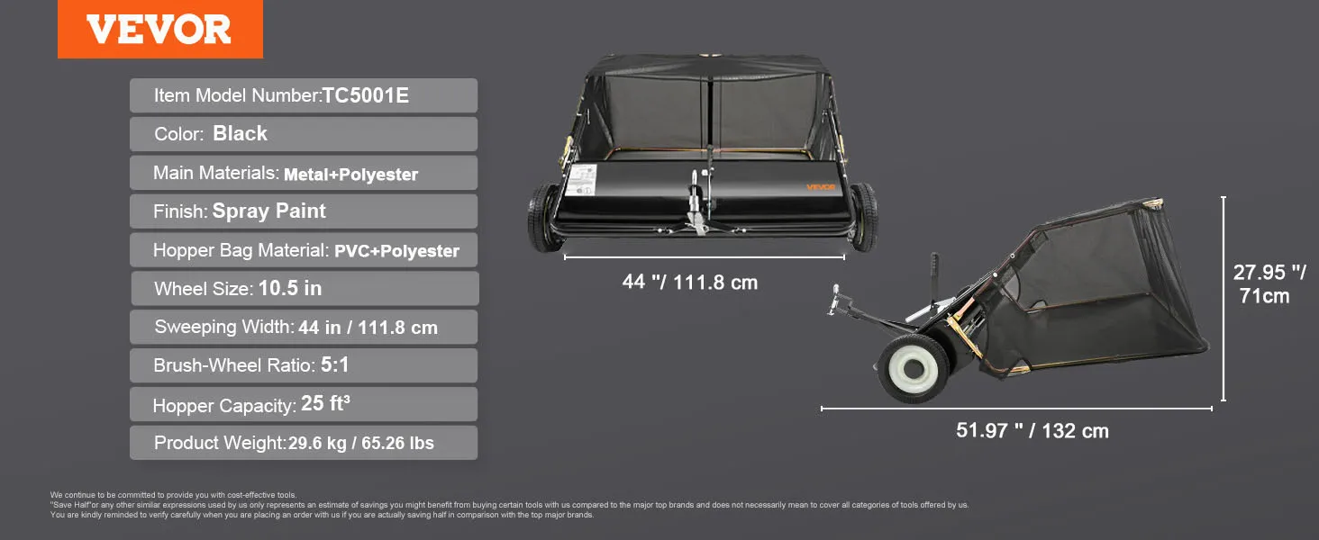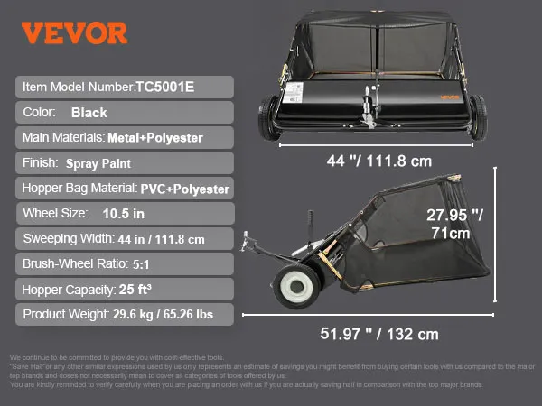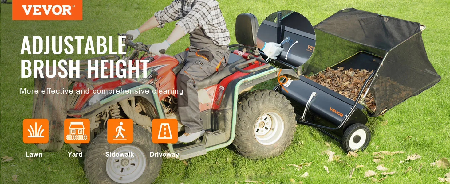 VEVOR Tow Behind Lawn Sweeper, 111.7 cm Pull Behind Lawn Sweeper, 25 cu. ft Large Capacity Leaf & Grass Collector, Heavy Duty Garden Sweeper with Adjustable Sweeping Height for Yard, Lawn, Farm