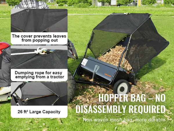 With a large non-woven hopper bag on this lawn sweep, you can collect more grass, leaves, and debris at once without frequent dumping. The bag can be easily emptied from a tractor with a dumping rope.