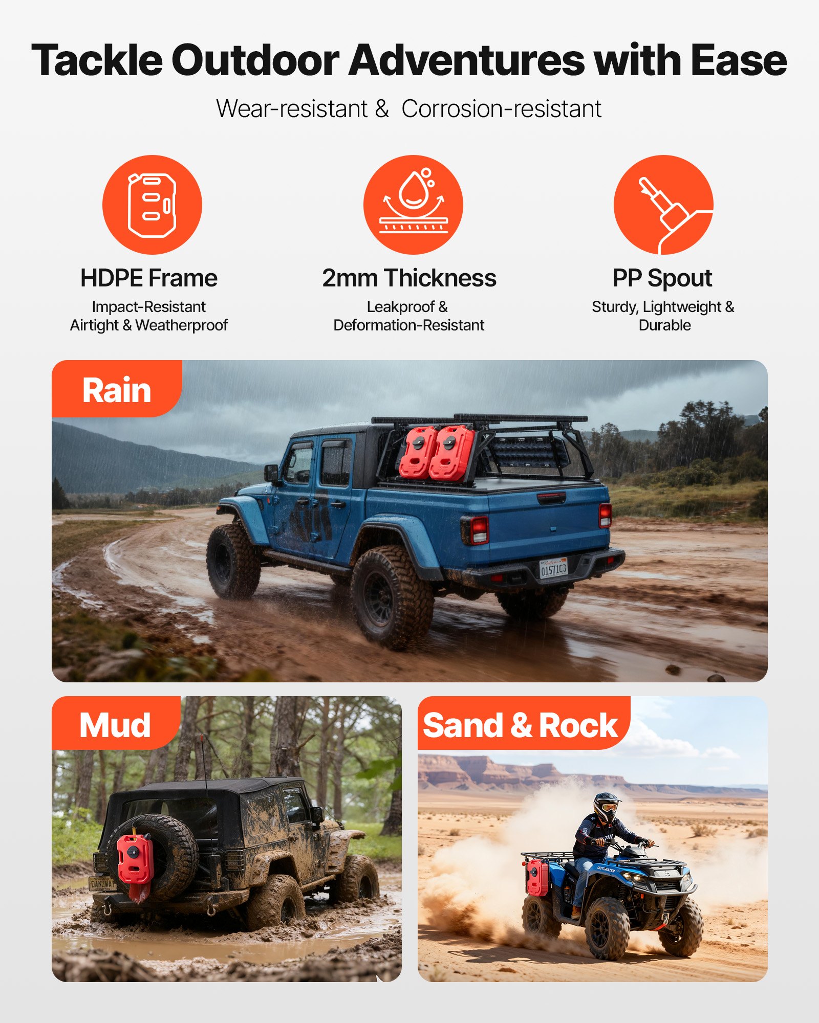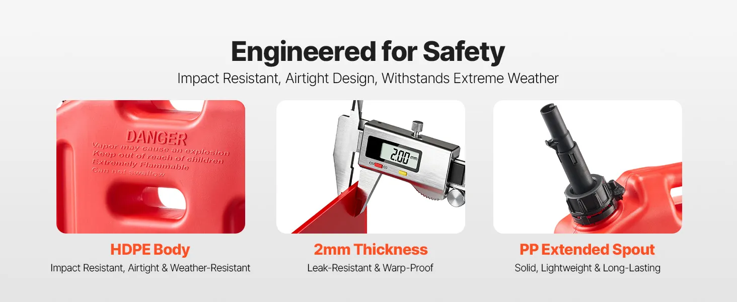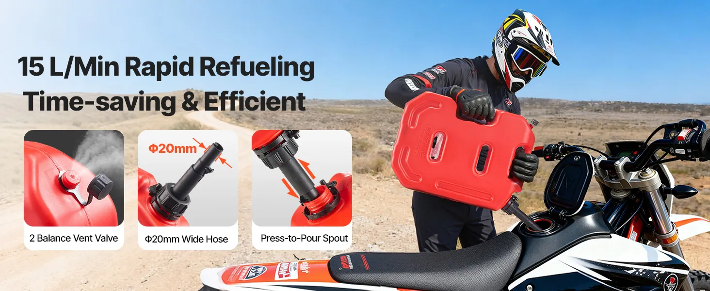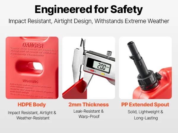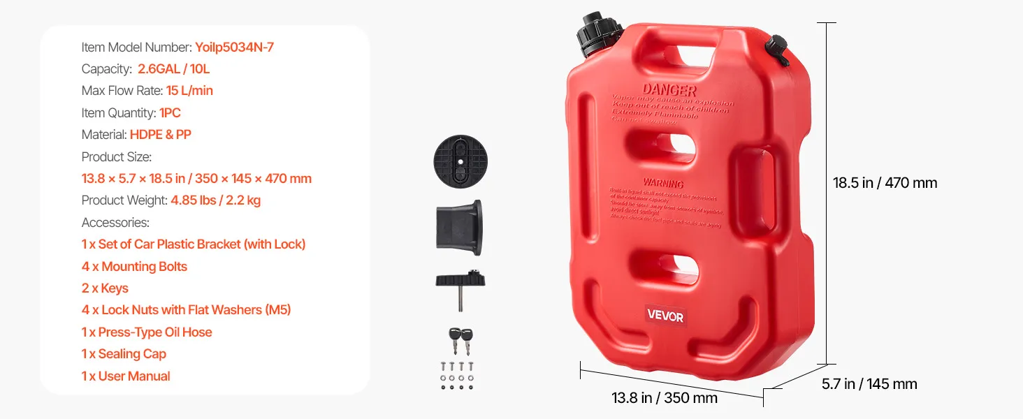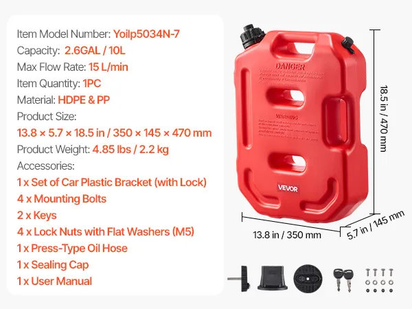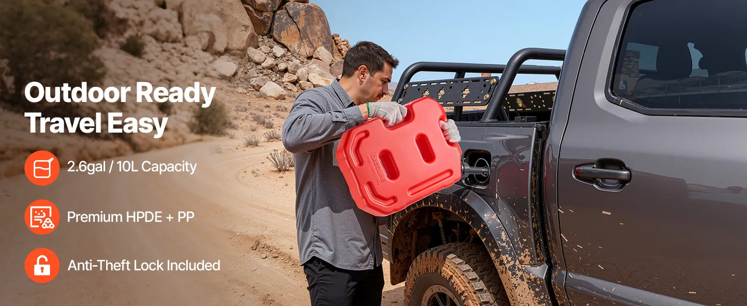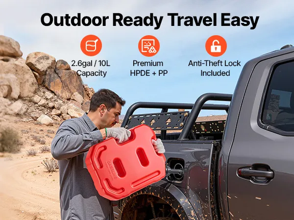 This 10L portable fuel container is made of thick HDPE with 2 mm walls for strength and durability. It features a leak-proof cap, anti-loosening buckle, and PP spout for smooth 15 L/min pouring. With an anti-theft lock, it's ideal for cars, motorcycles, off-road trips, and outdoor use.