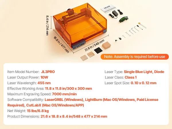 Unleash your creativity with an 11.8 x 11.8 in working area and 7000 mm/min engraving speed. Cut through 0.2 in basswood in a single pass and achieve fine details with a 0.10 x 0.12 mm blue laser spot. With laser Class 1 design, it supports LaserGRBL, LightBurn (paid), and CutLabX APP.
