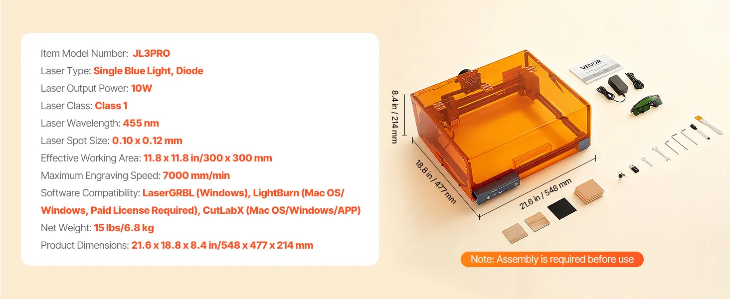 VEVOR Laser Engraver, 10W, Laser Engraving and Cutting Machine with Enclosure, Laser Cutter Engraver Machine, 300 x 300 mm Working Area, 7000 mm/min, for Wood, Leather, Glass, Certain Metal, Class 1
