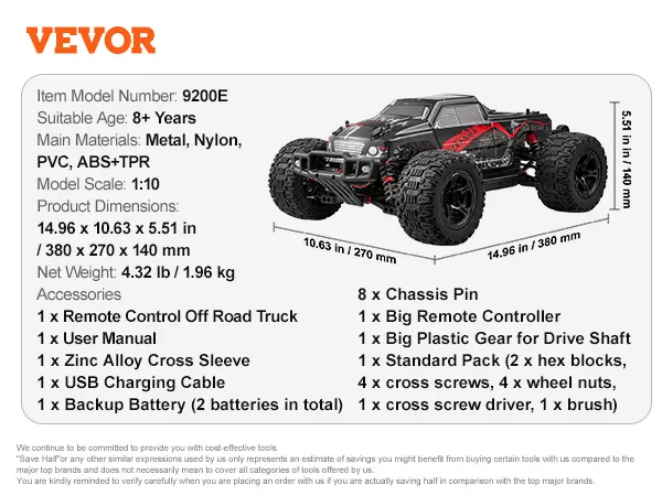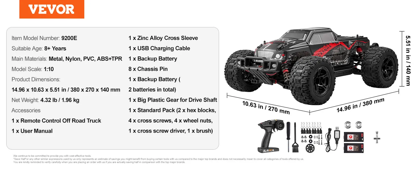 • Strong Off-road Capability: VEVOR 1:10 remote control car is equipped with four-wheel drive system, sturdy metal drive shaft, 12,000 RPM super speed motor, and high-grip rubber tires, showing extraordinary off-road capability to cope with all terrains – grass, slopes, gravels, mud and sand.