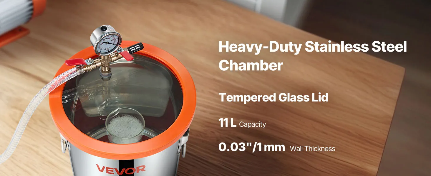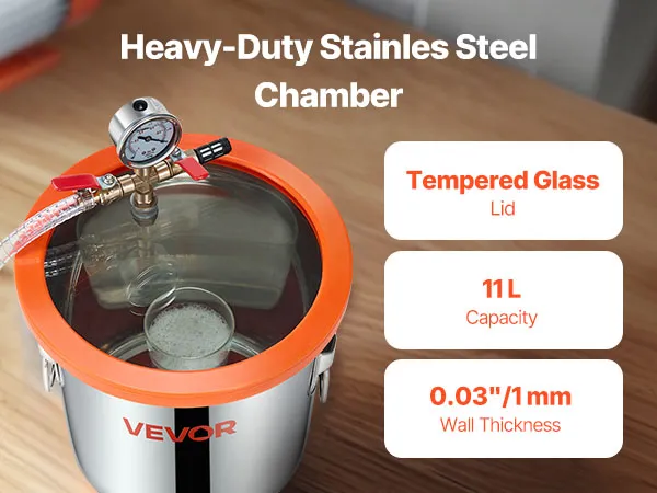 • Вакуумная камера объемом 11,36 л: Изготовленная из качественной нержавеющей стали, наша вакуумная камера выдерживает высокое давление без деформации. Крышка из закаленного стекла позволяет легко контролировать процесс дегазации и настраивать результаты для достижения оптимальной производительности.