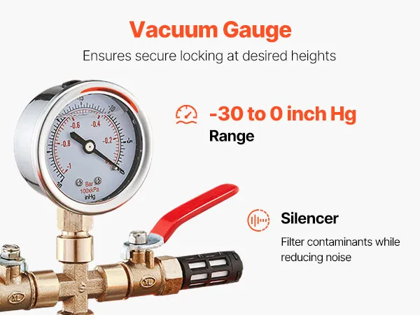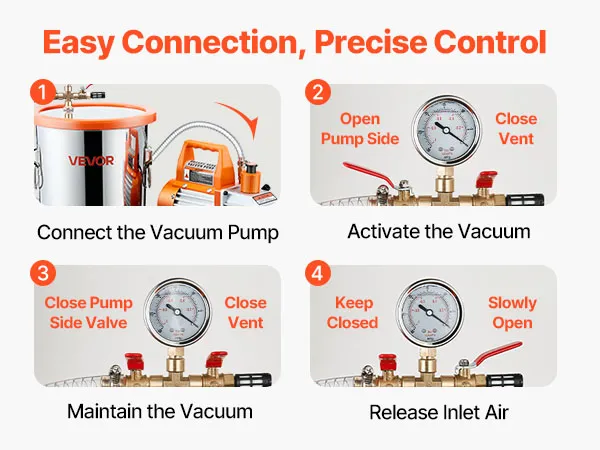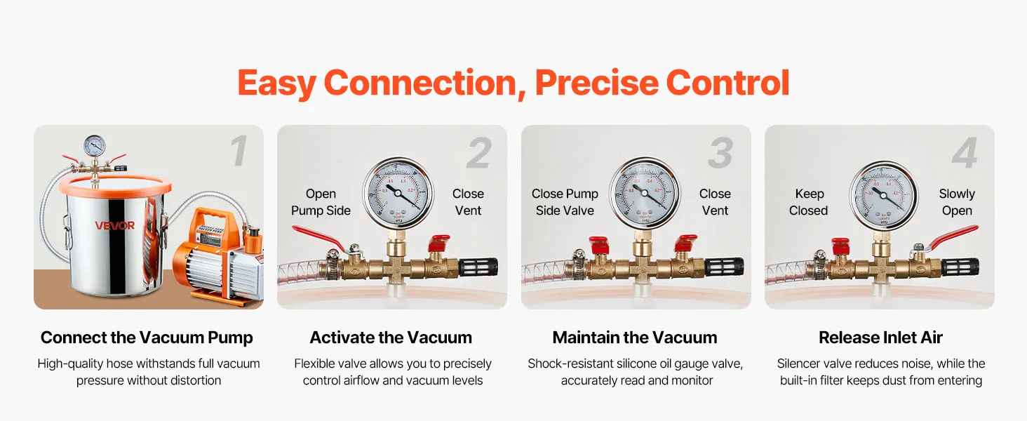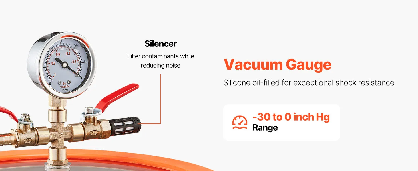 • Все, что вам нужно: В этот комплект входят вакуумный насос, вакуумная камера объемом 11,36 л, крышка из закаленного стекла, набор вакуумметров, красно-синий ручной запорный клапан, шланг длиной 4,92 фута, силиконовая прокладка и бутылка с маслом для вакуумного насоса объемом 0,35 л (330 мл).