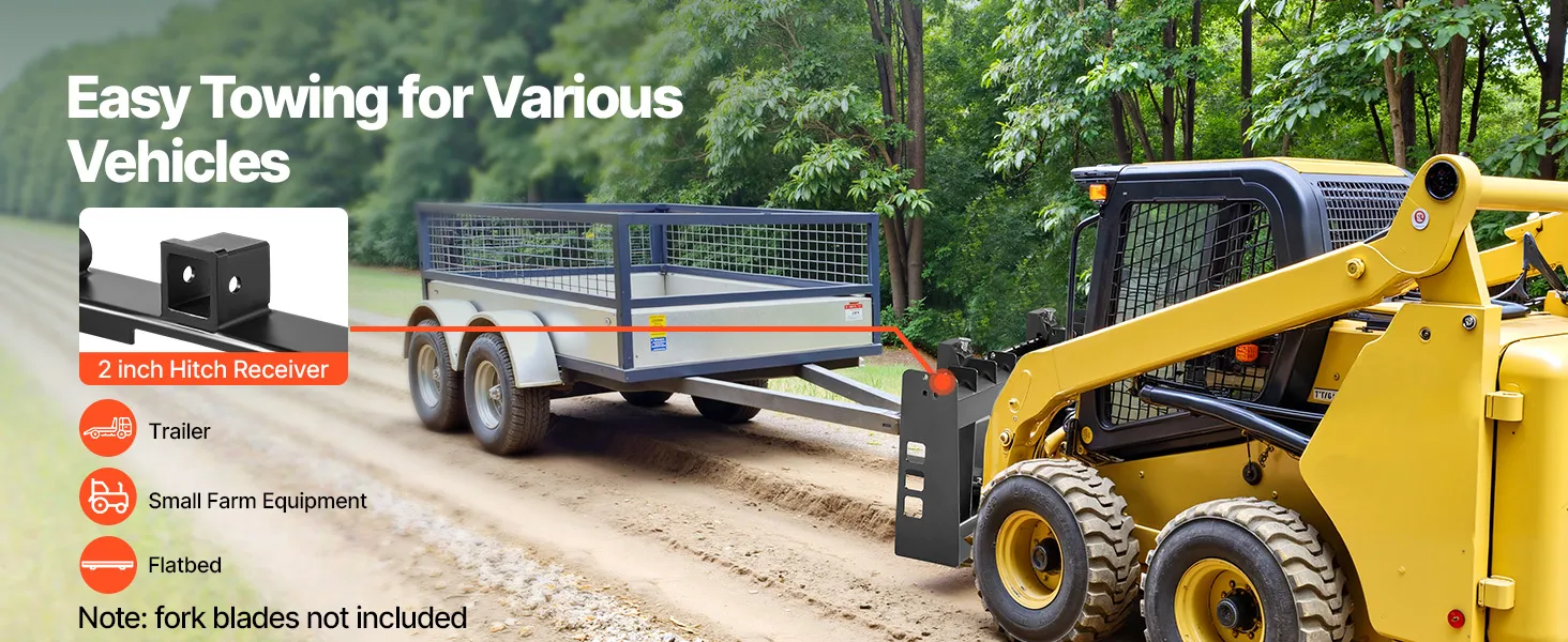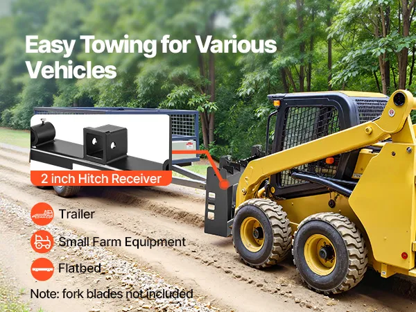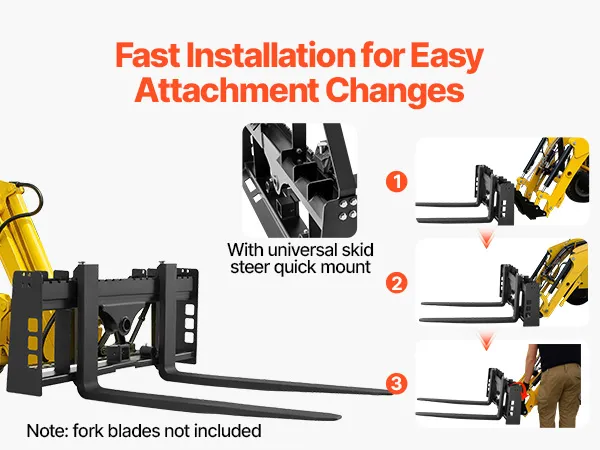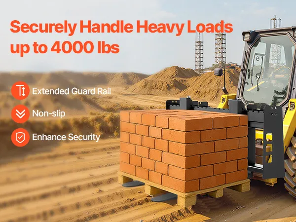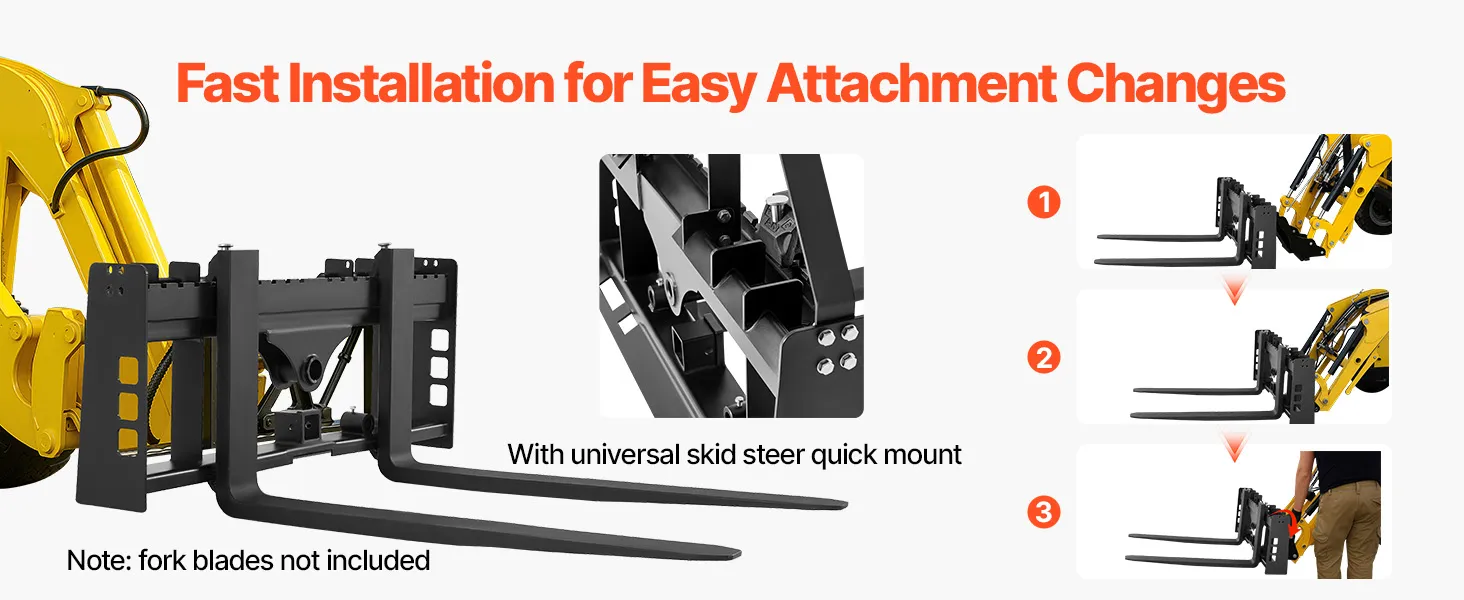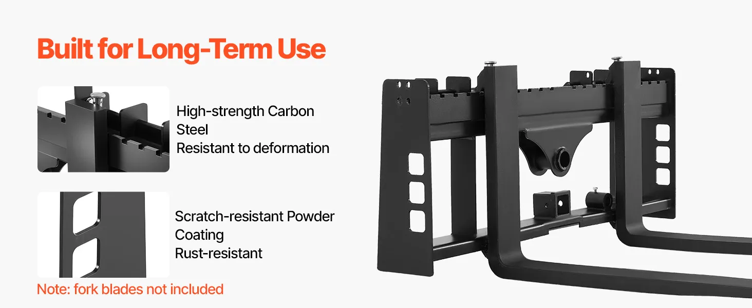 This 4000 lbs-rated pallet forks frame fits most skid steers and tractors. Ideal for moving hay bales, building materials, and more on farms, gardens, or construction sites. Efficient and reliable for heavy-duty tasks.