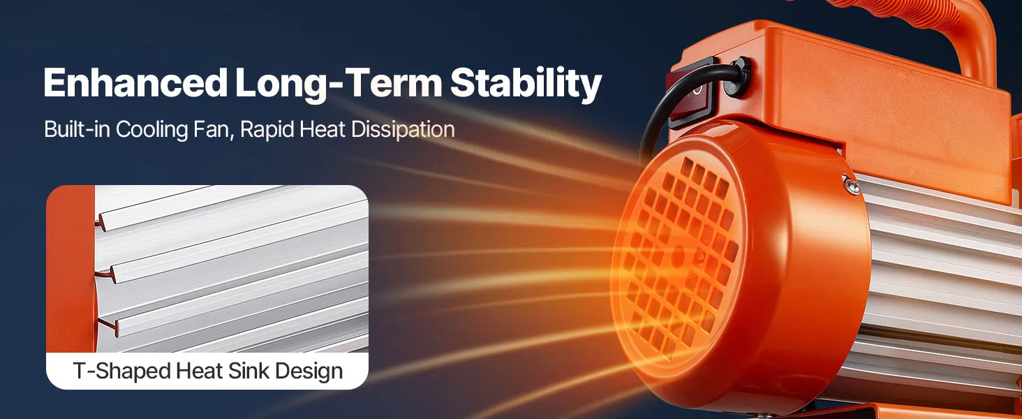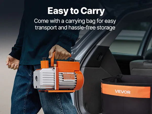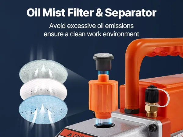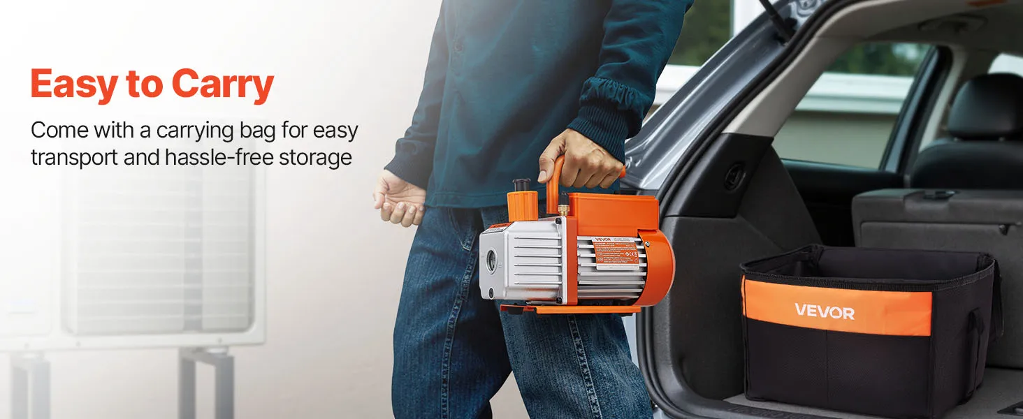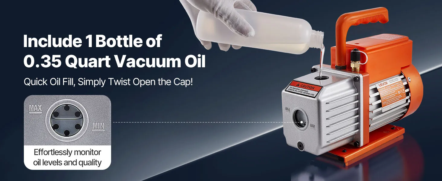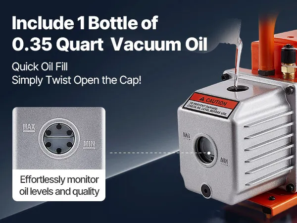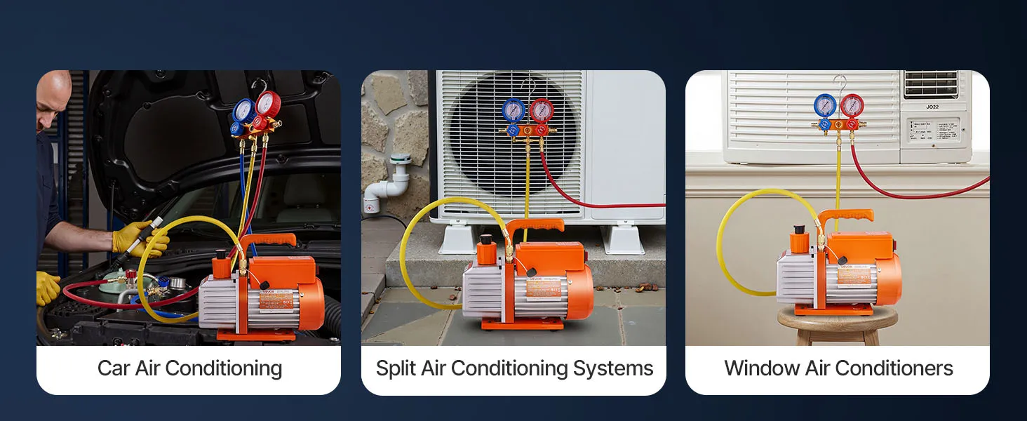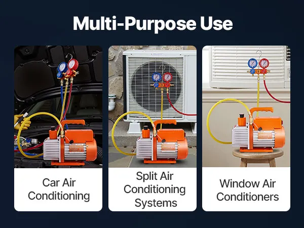 A: The pump features a single-stage rotary vane design with a flow rate of 4 CFM, making it ideal for home air conditioning systems. It achieves a vacuum level of ≤20Pa, is compatible with refrigerants such as R134a, R22, R410a, R1234YF, and R32, including A2L and A1 refrigerants.
