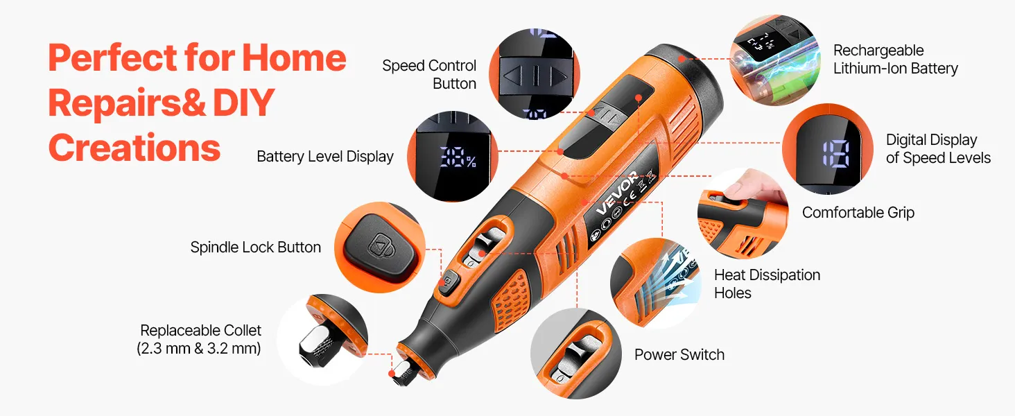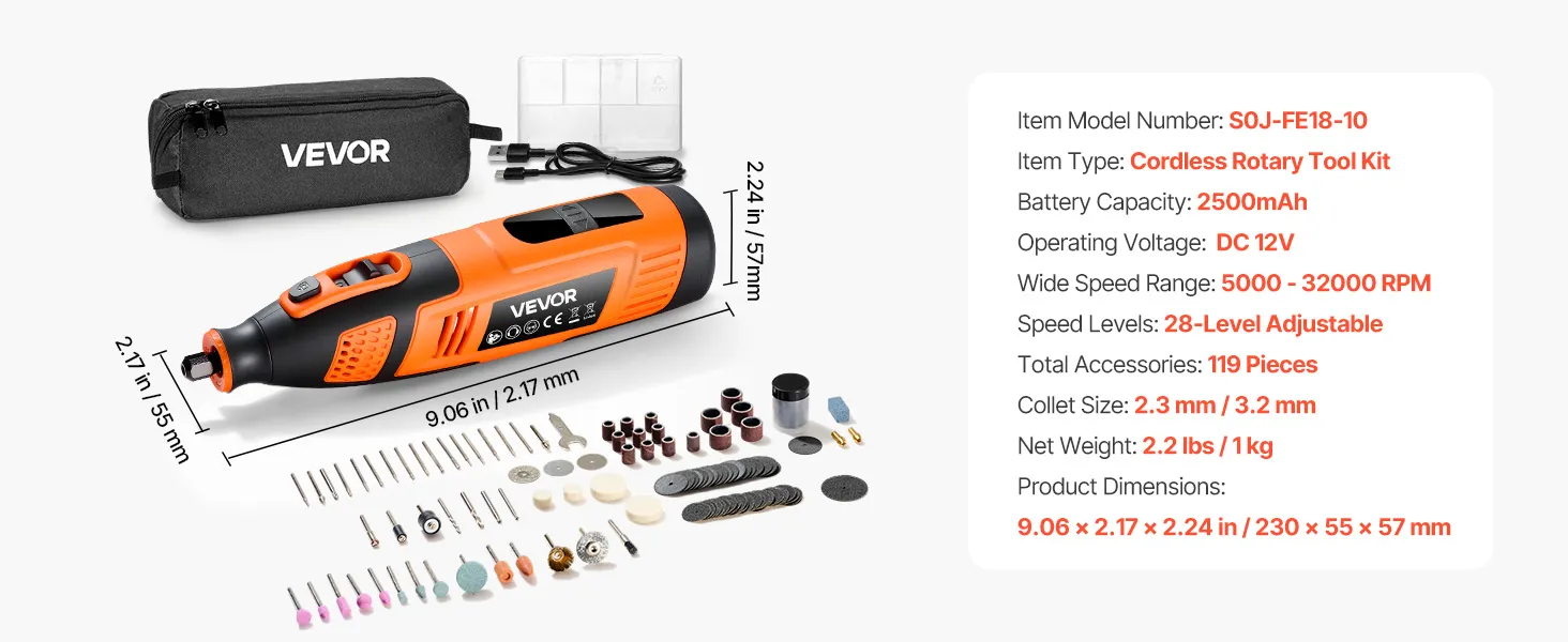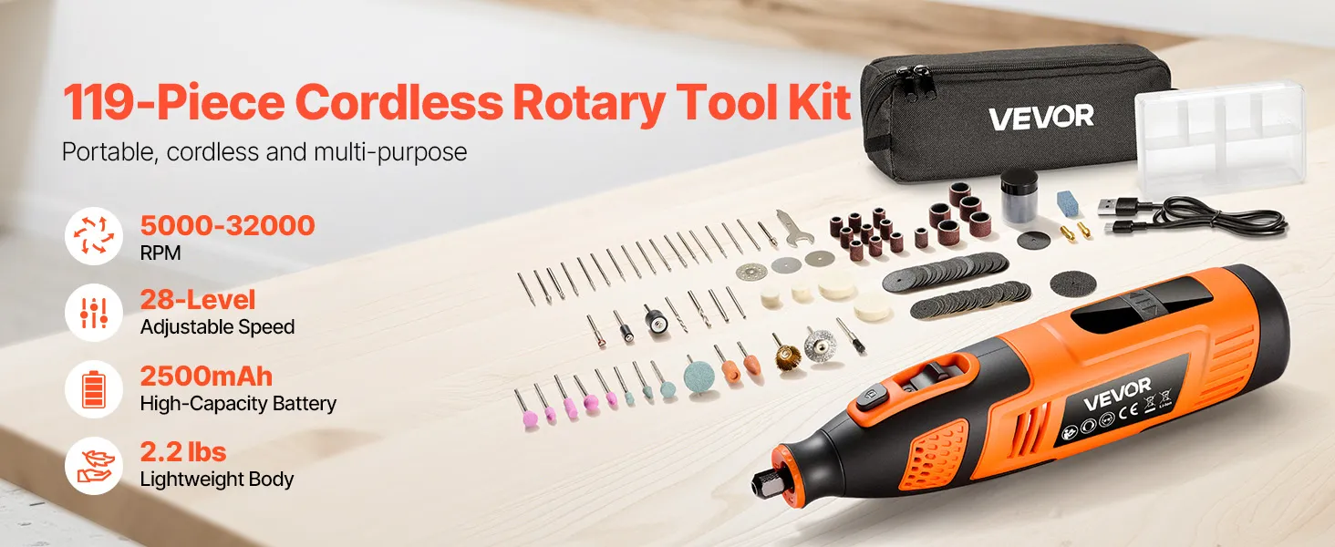 The VEVOR 119-piece DC12V cordless rotary tool kit delivers versatile functionality for cutting, sanding, drilling, grinding, carving, engraving, polishing, and cleaning. Featuring 28 adjustable speeds (5000-32000 RPM) and a slim, lightweight design, it is ideal for various DIY creative projects.