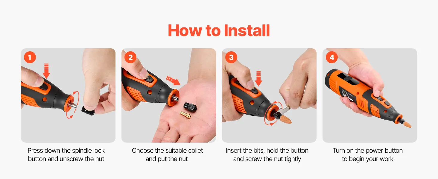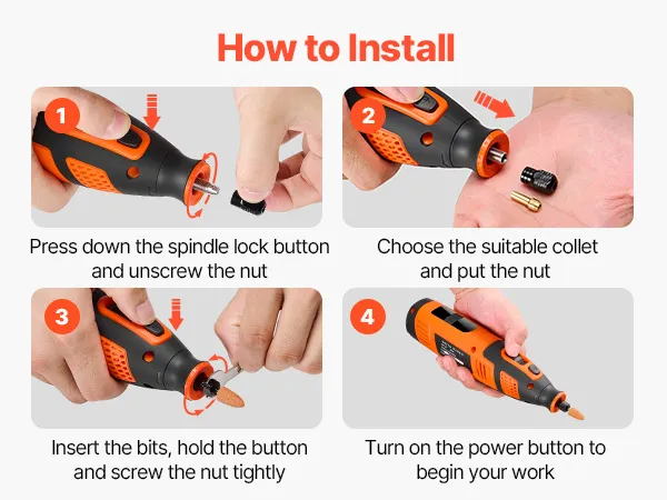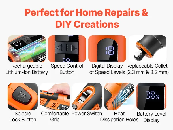Includes 2.3mm (3/32") and 3.2mm (1/8") collets, along with a spindle lock button for quick and easy accessory changes. Simple operation makes DIY projects more effortless and efficient.