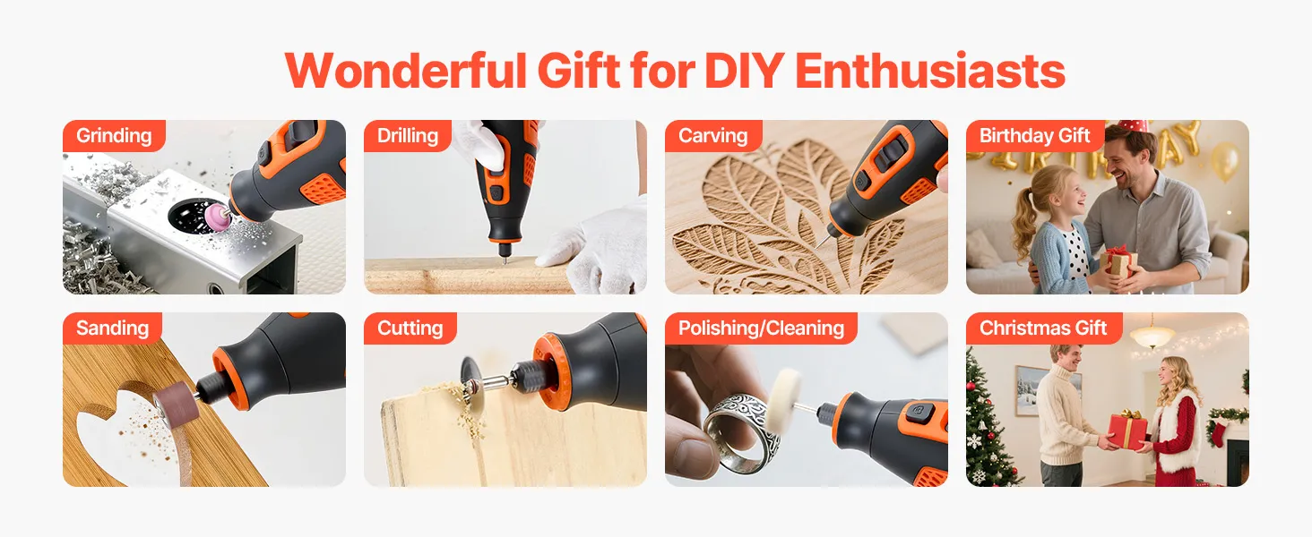 A perfect gift for DIY enthusiasts, this multifunctional DIY rotary tool easily tackles grinding, drilling, carving, sanding, cutting, and polishing/cleaning tasks. Complete all your creative projects effortlessly!