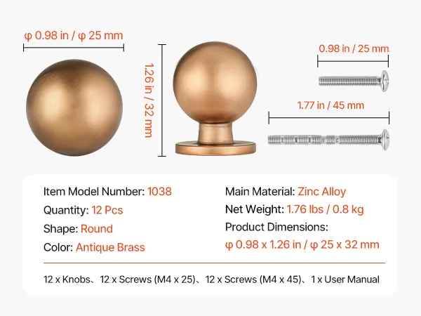 VEVOR Cabinet Knobs, 12 Pack, 25 mm Zinc Alloy Drawer Pulls Door Handles, Round Kitchen Dresser Solid Knobs Cupboard Hardware with Screws for Bathroom Closet Cabinets Drawers, Antique Brass Color