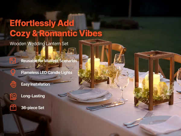 The wooden wedding lantern provides all you need in one set. It includes 36 decorative pieces in a combination, allowing for convenient installation. With a flameless design for security, it’s suitable for reusable use in various scenarios such as weddings and festivals.