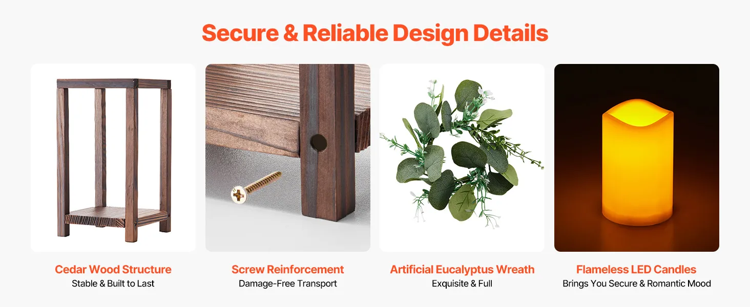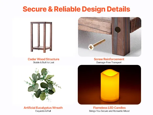 Our wood lantern adopts solid cedar wood with reinforced screws to withstand transport bumps, paired with a delicate artificial eucalyptus wreath for added charm. Equipped with flameless LED candles, it delivers reliable usage for indoor scenarios.