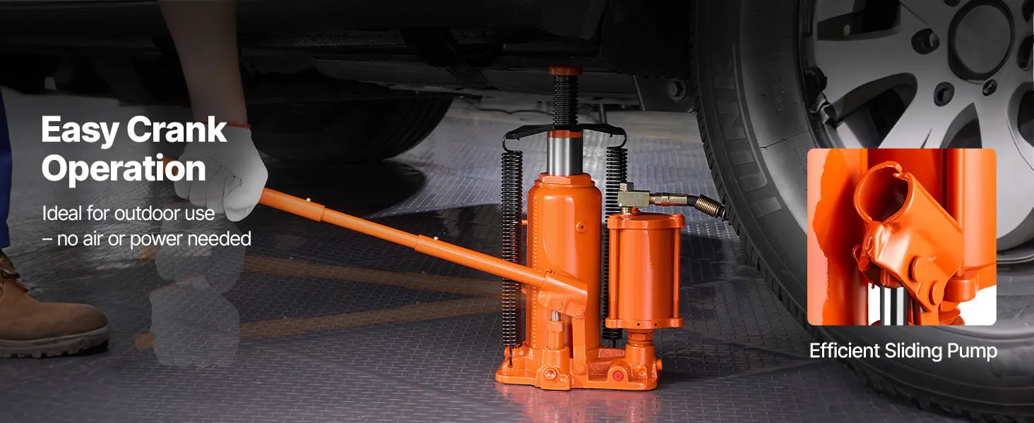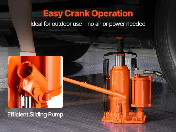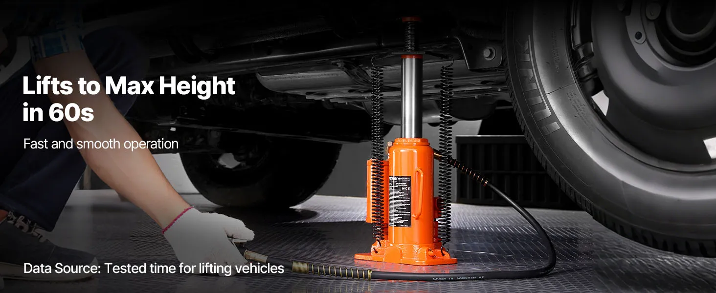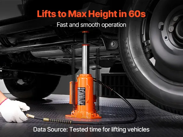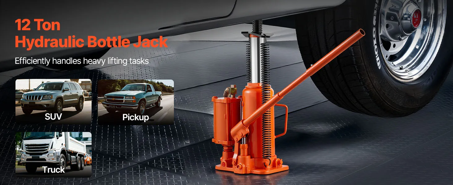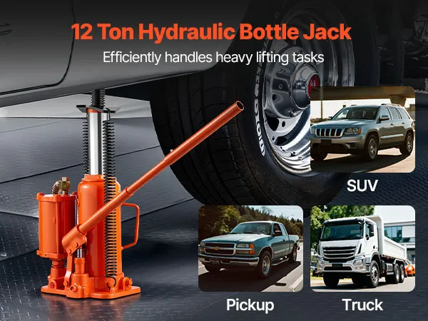 This manual and pneumatic hydraulic bottle jack uses hydraulic force to lift up to 12 tons with stability. It handles heavy-duty tasks like vehicle repairs or home maintenance on SUVs, trucks, and pickups.
