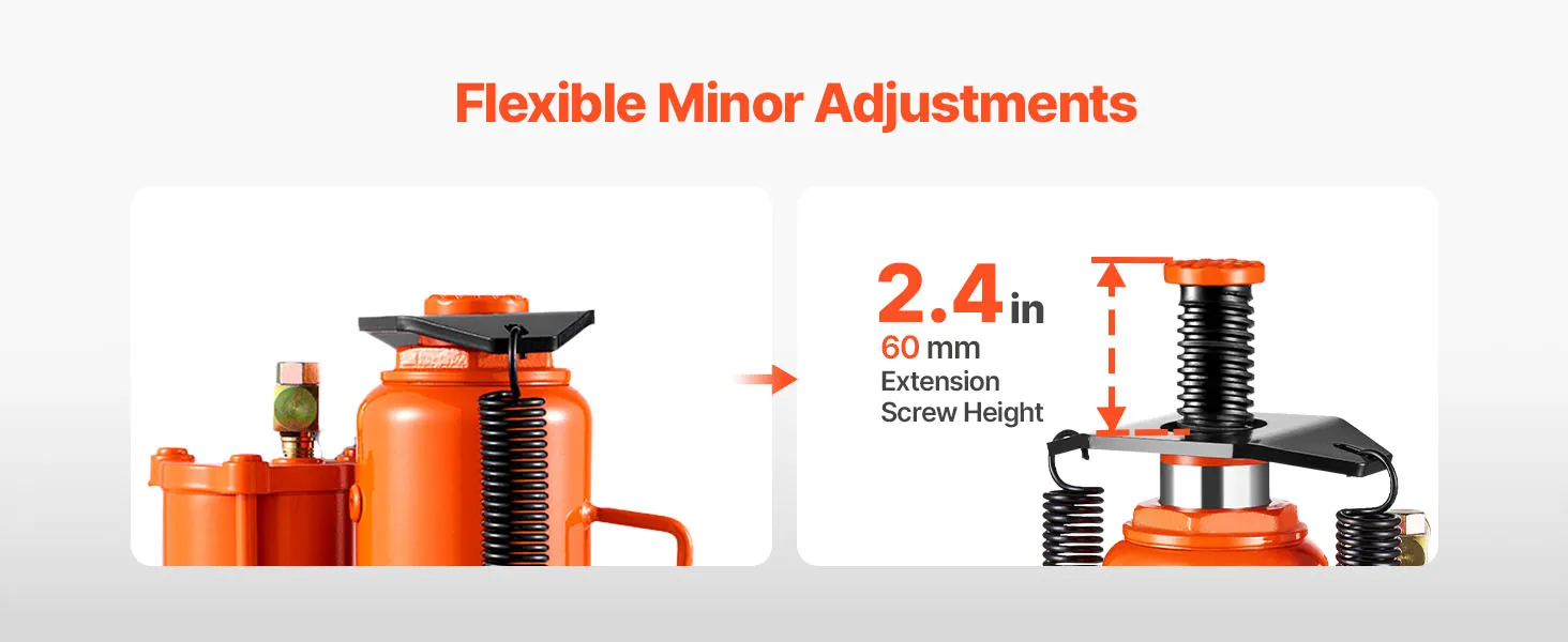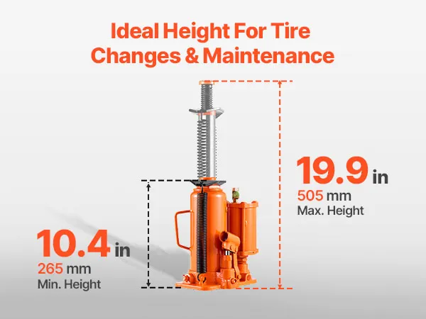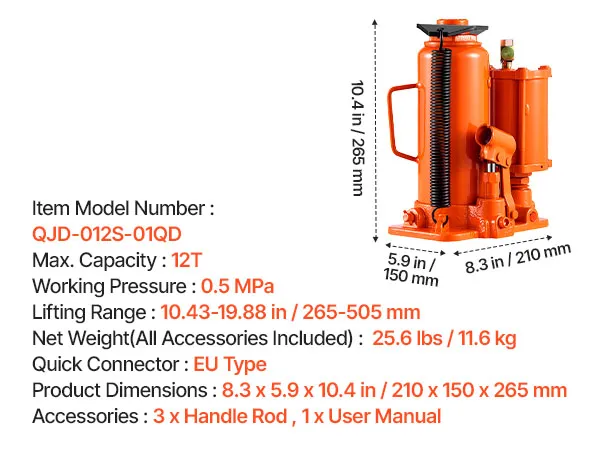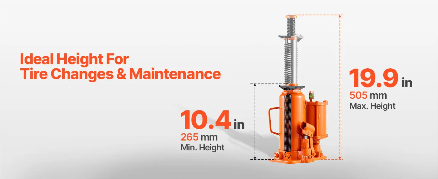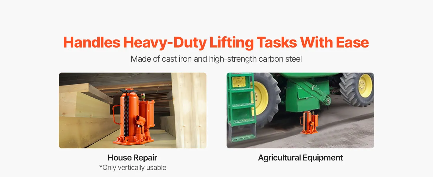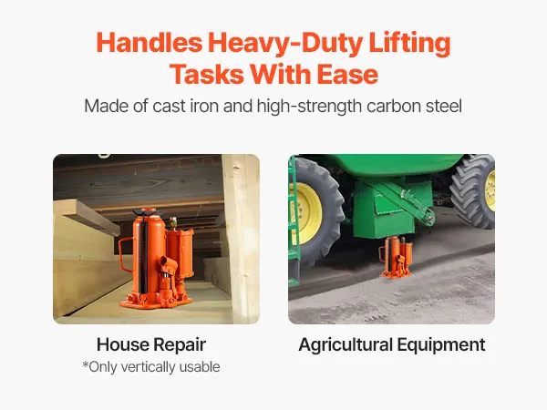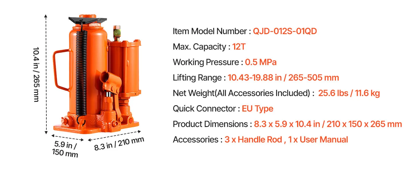 This manual and pneumatic hydraulic bottle jack uses hydraulic force to lift up to 12 tons with stability. It handles heavy-duty tasks like vehicle repairs or home maintenance on SUVs, trucks, and pickups.