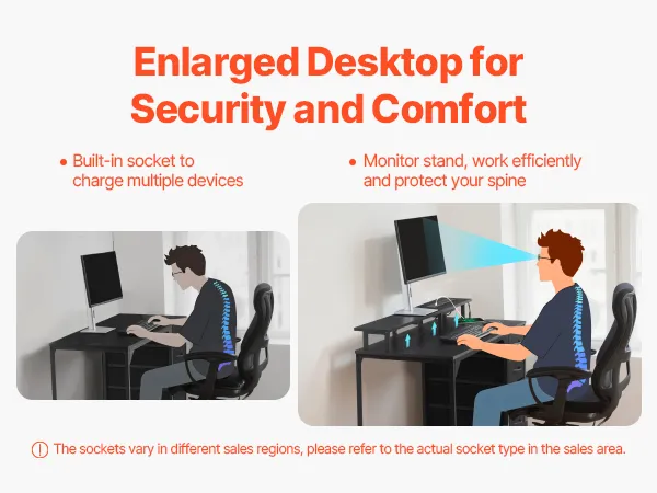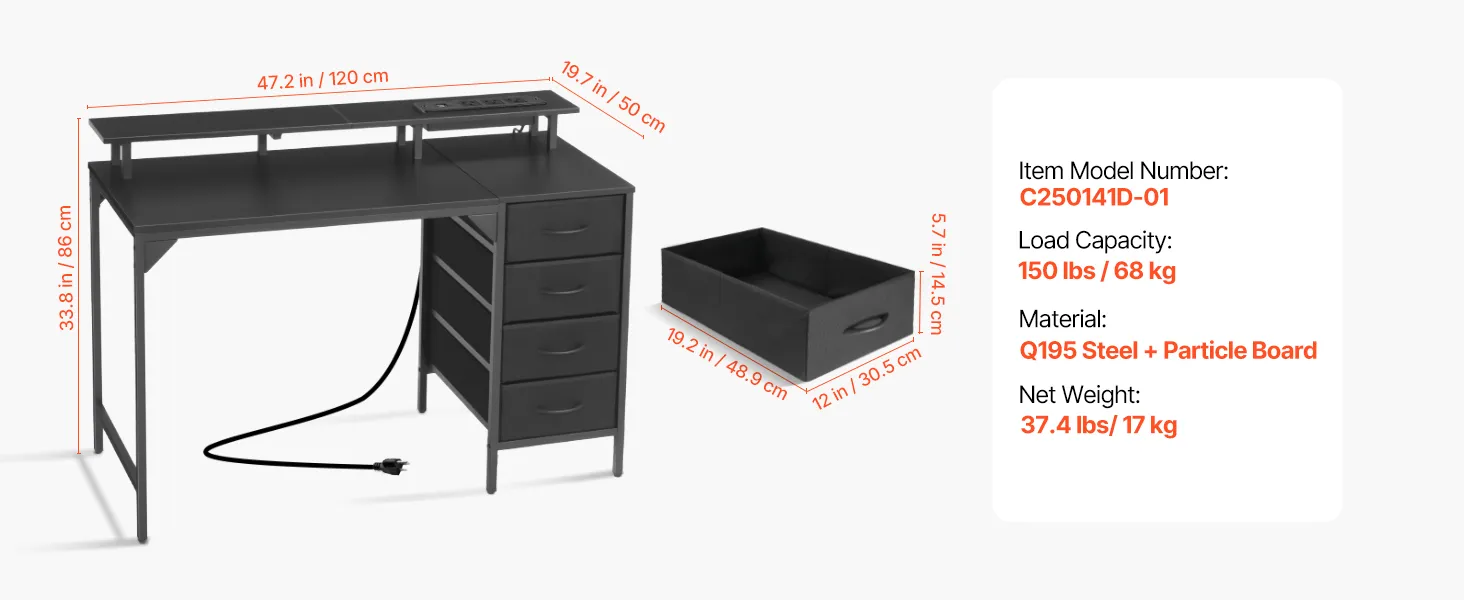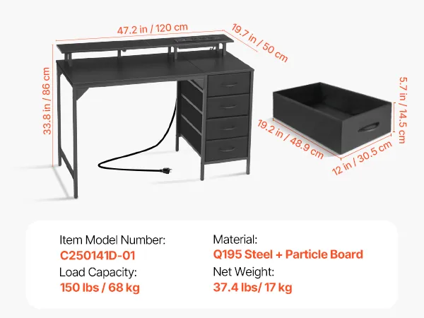 • Upgrade Your Workspace: A built in power strip offers 4 three prong outlets, 2 USB ports, and 1 Type C port for phones and gaming gear, plus 4 large fabric drawers for organized storage of files and study supplies on a fixed rectangular desk layout