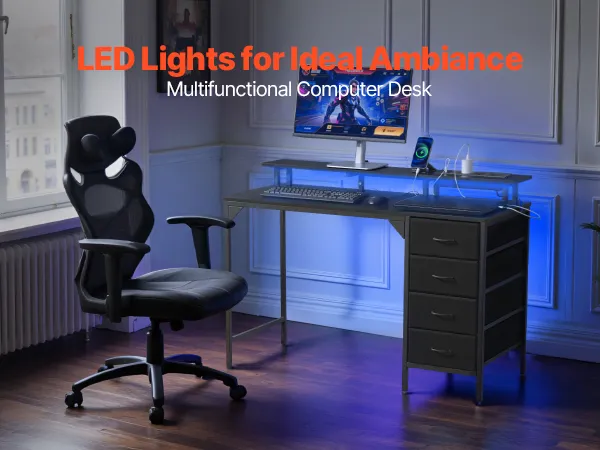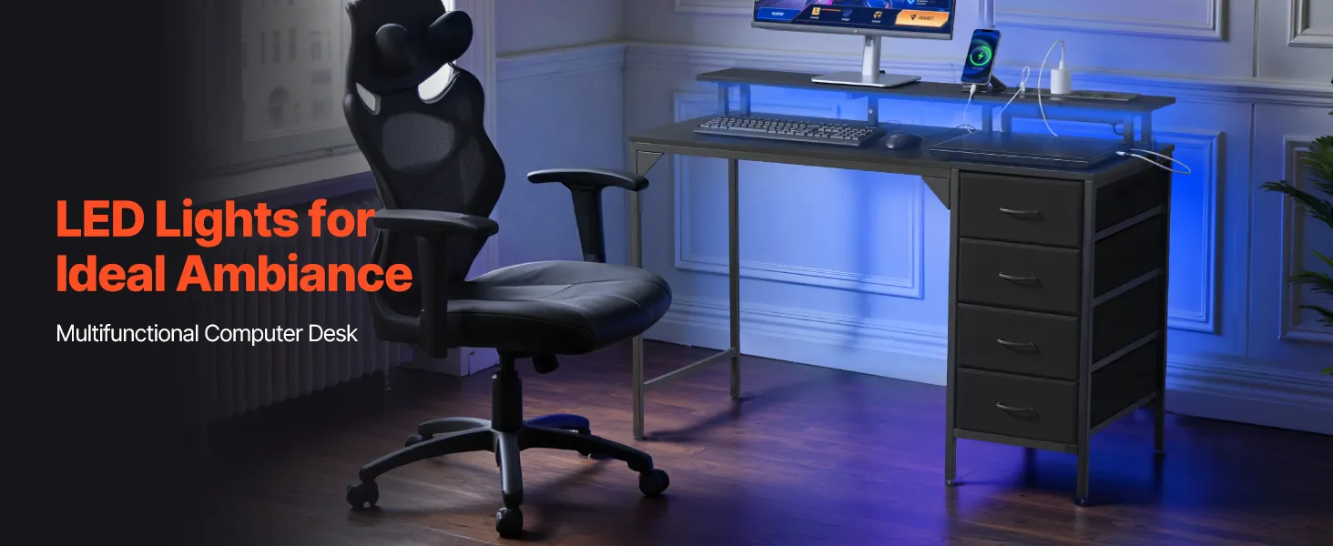 VEVOR 120 см Компьютерный Стол с RGB LED Подсветкой, Розетками, 4 Ящиками, Подставкой для Монитора, Черный