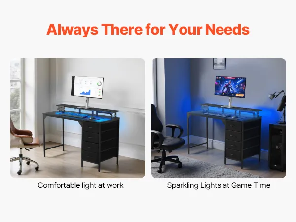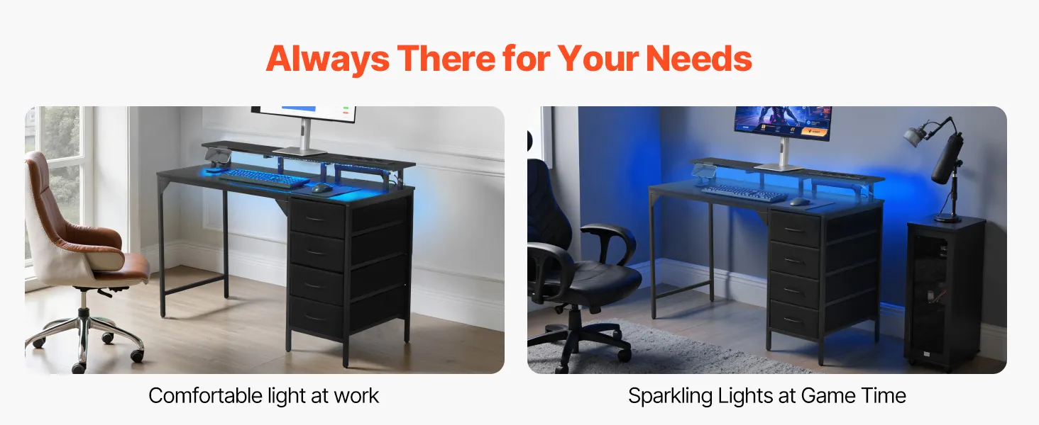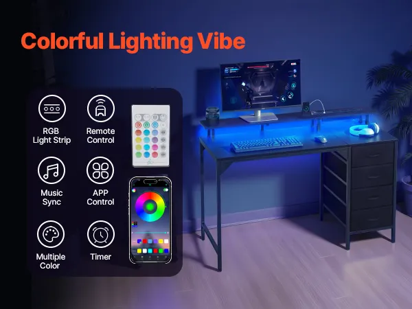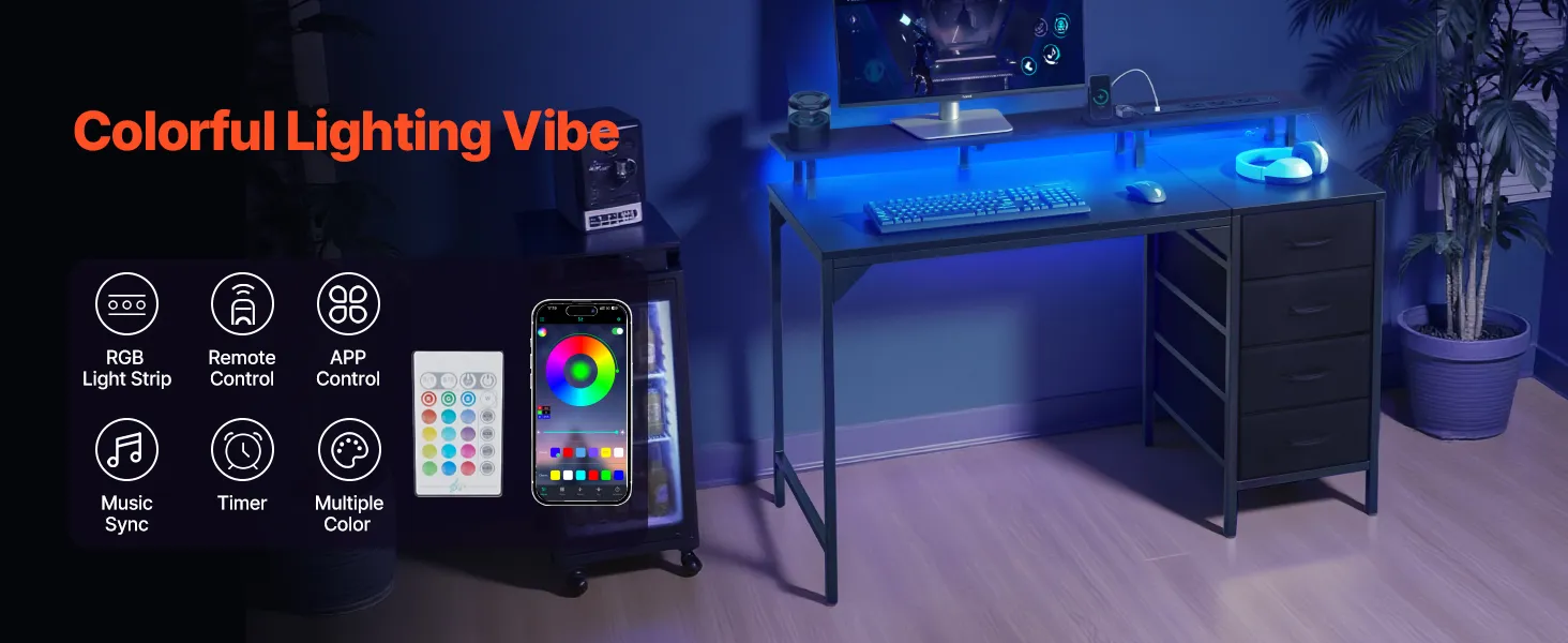 • Smart Lighting Ambience: This computer desk includes an RGB light strip controlled by remote or app, with music sync, timer, and brightness modes, it changes color to match rhythm and sets day or holiday vibes for home office and gaming setups