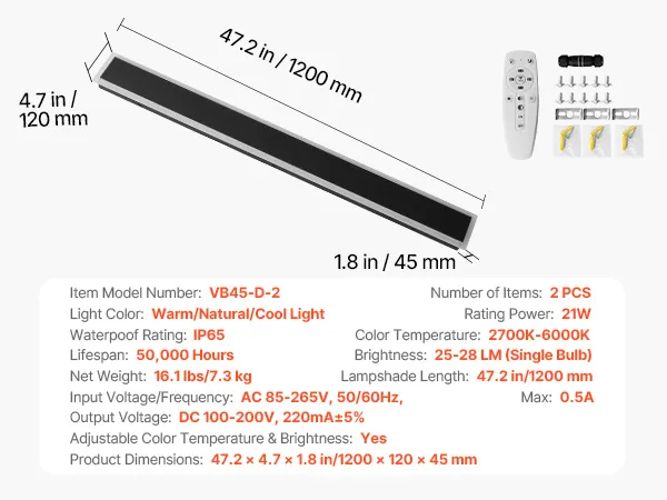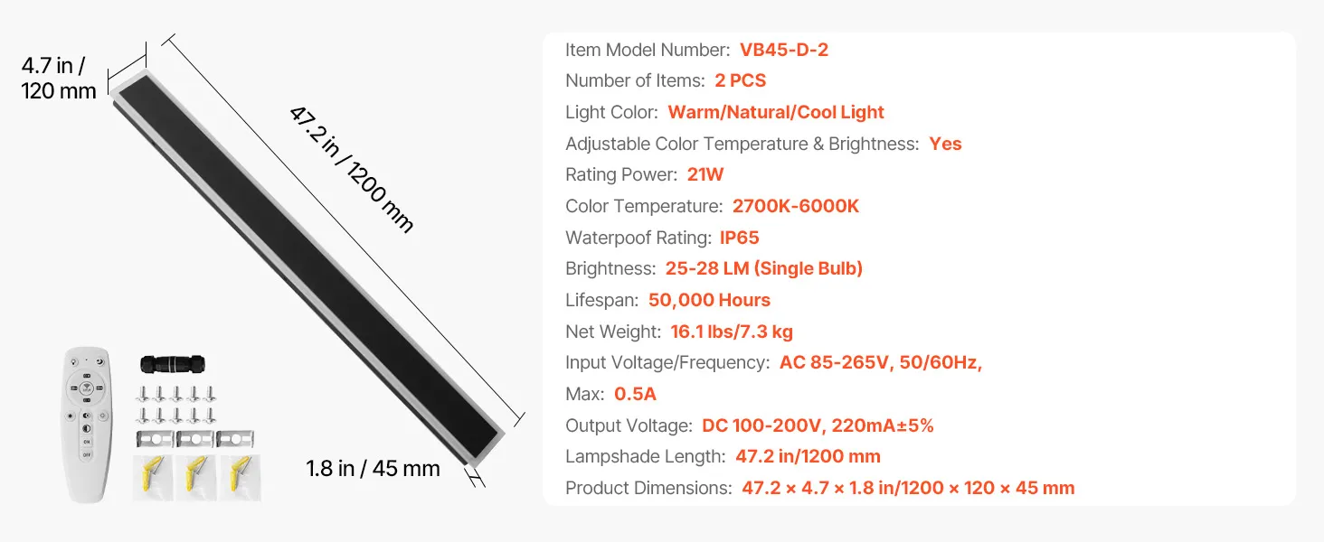 VEVOR Outdoor Wall Lights, 2 Pack, 1200 mm Long Strip Modern Exterior Wall Sconce Light Fixtures, 2700K-6000K, IP65 Waterproof Anti-Rust, Dimmable Outside Wall Mount Lighting, for House Porch Garage
