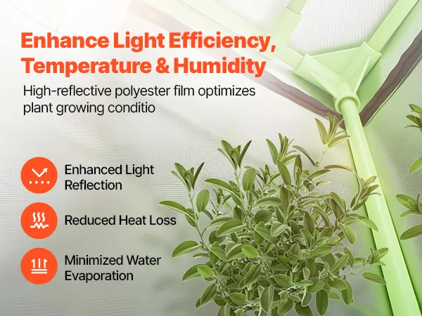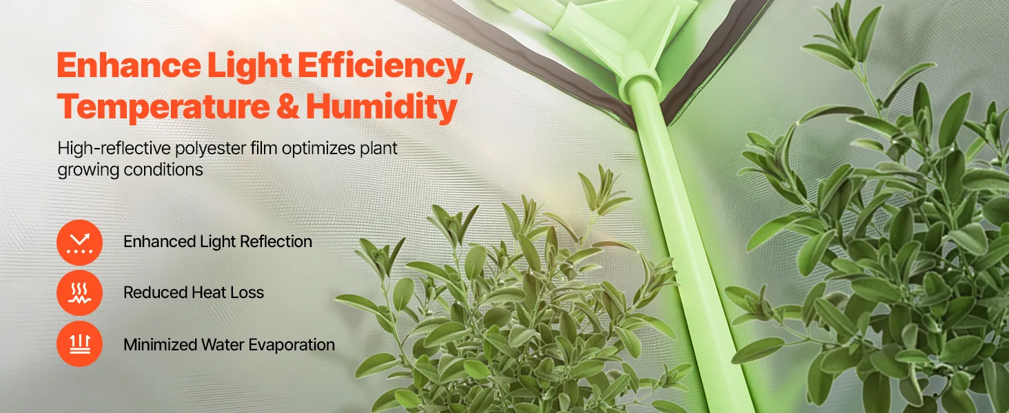 Featuring high-reflection polyester film, the indoor plant tent maximizes light reflection, reducing energy waste. It also minimizes heat loss, maintaining a stable internal temperature for cold regions. The film's sealing properties help retain humidity and reduce water evaporation.