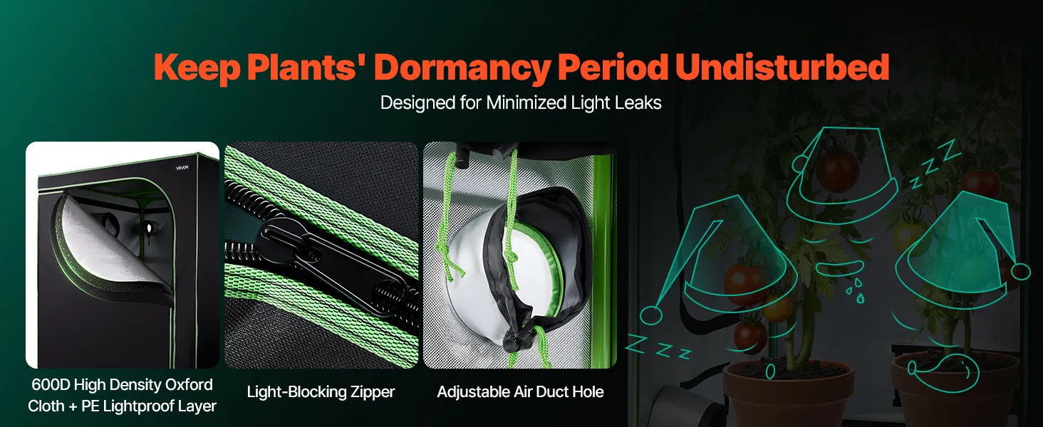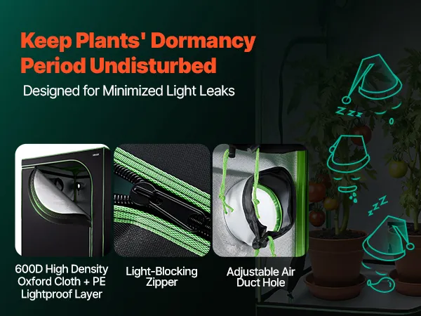 The grow tent for indoor plants features light-blocking zippers and sealed ventilation openings that effectively prevent light leakage, ensuring your plants experience the proper dark cycle for healthy growth and dormancy. This helps boost overall growing efficiency.