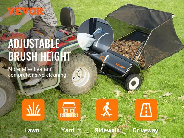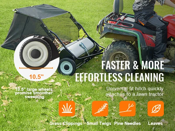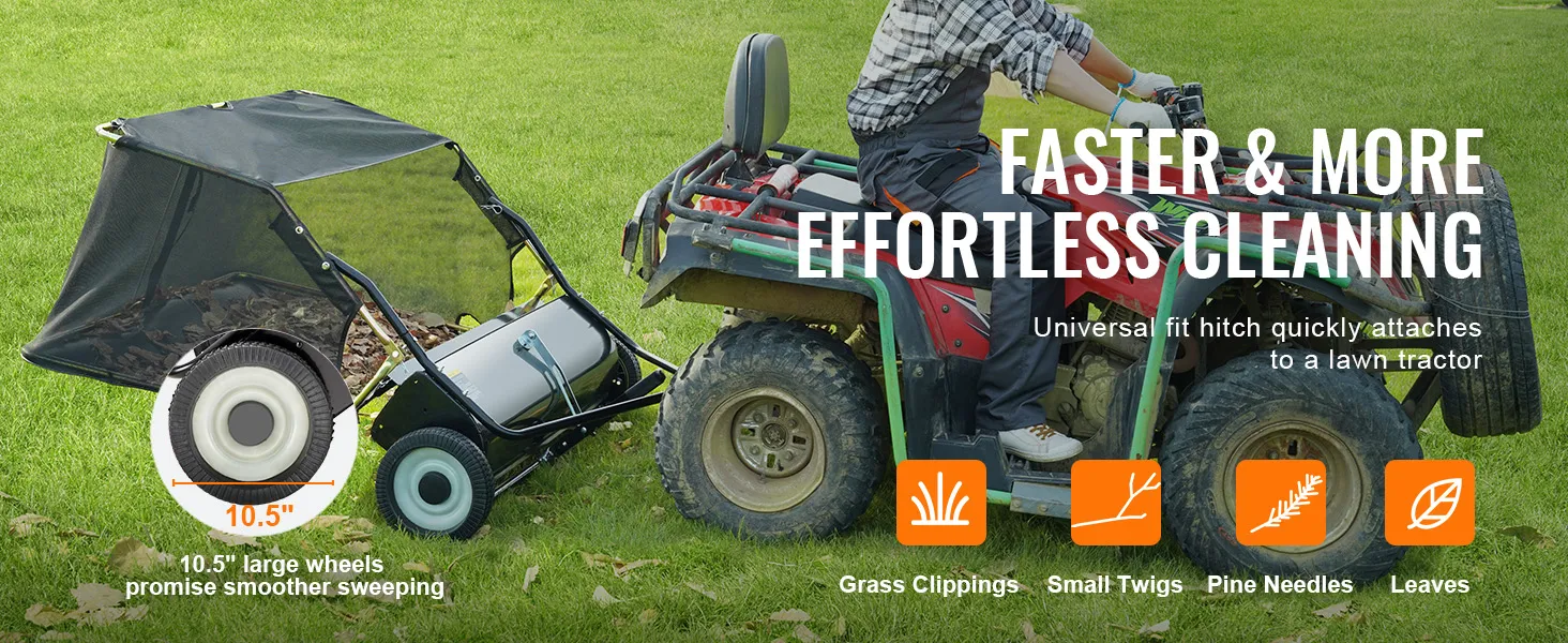 Our tow-behind lawn sweeper is designed for use with ATVs, UTVs, and tractors, efficiently clearing leaves and debris from lawns, yards, sidewalks, and driveways. Whether you're dealing with large lawns or narrow driveways, this sweeper gets the job done with ease.