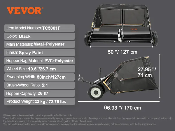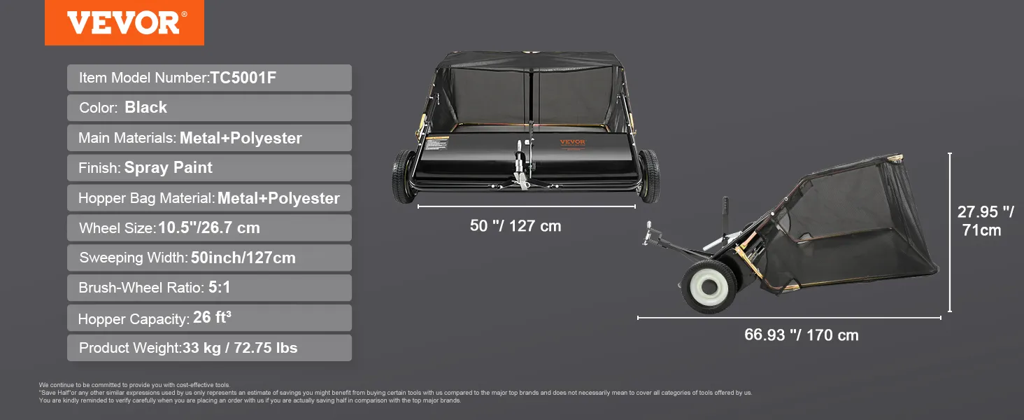 VEVOR Tow Behind Lawn Sweeper, 127 cm Pull Behind Lawn Sweeper, 26 cu. ft Large Capacity Leaf & Grass Collector, Heavy Duty Garden Sweeper with Adjustable Sweeping Height for Yard, Lawn, Farm