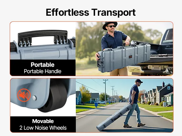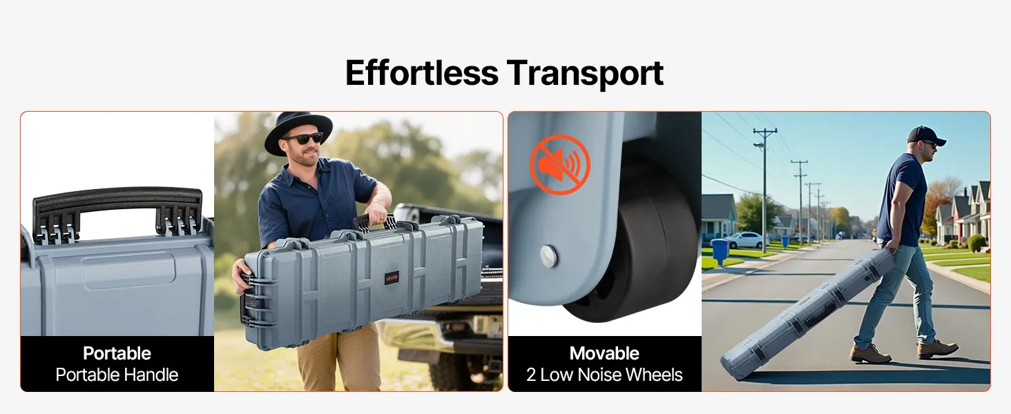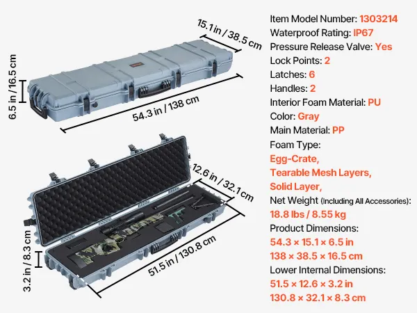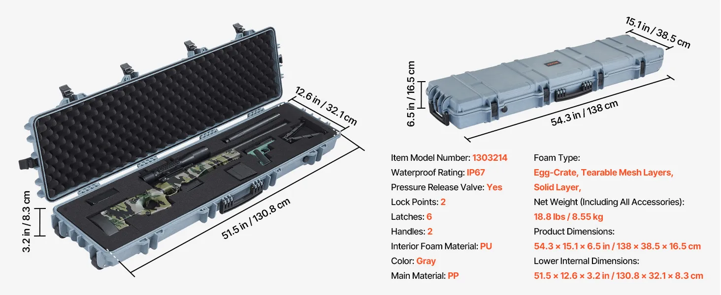 VEVOR Hard Rifle Case, Lockable Rifle Case with Pre-cut Foams, 1270 mm Movable Gun Storage with Wheels, IP67 Waterproof & Dustproof Pistol Storage for Rifle, Shotgun, Airsoft Gun, Grey