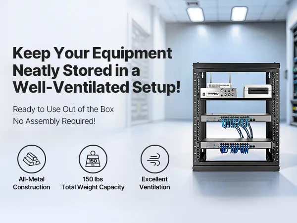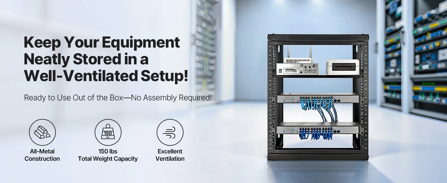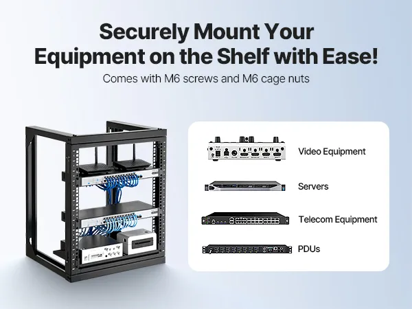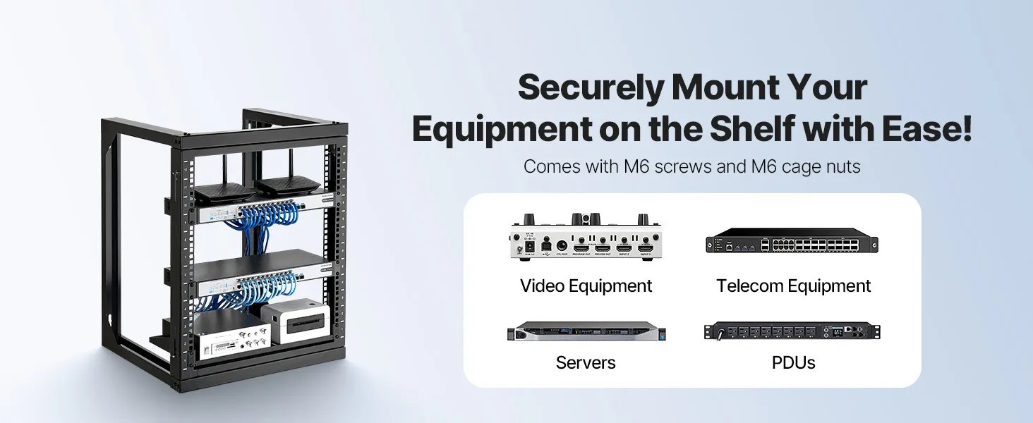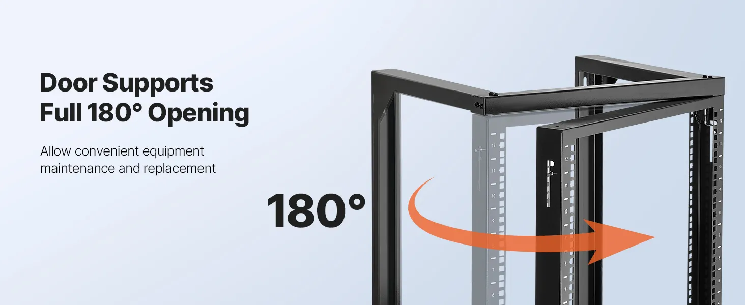 Our network rack features an open hinged door that supports 180° opening. With a solid carbon steel structure, it handles up to 150 lbs (68 kg) to keep your devices stable. With complete accessories, you can securely mount switches or other network devices directly onto the rack!
