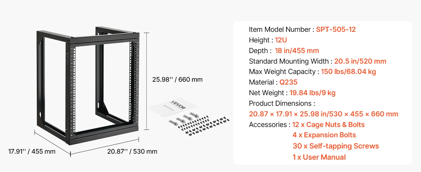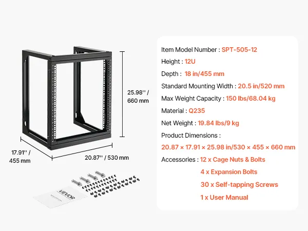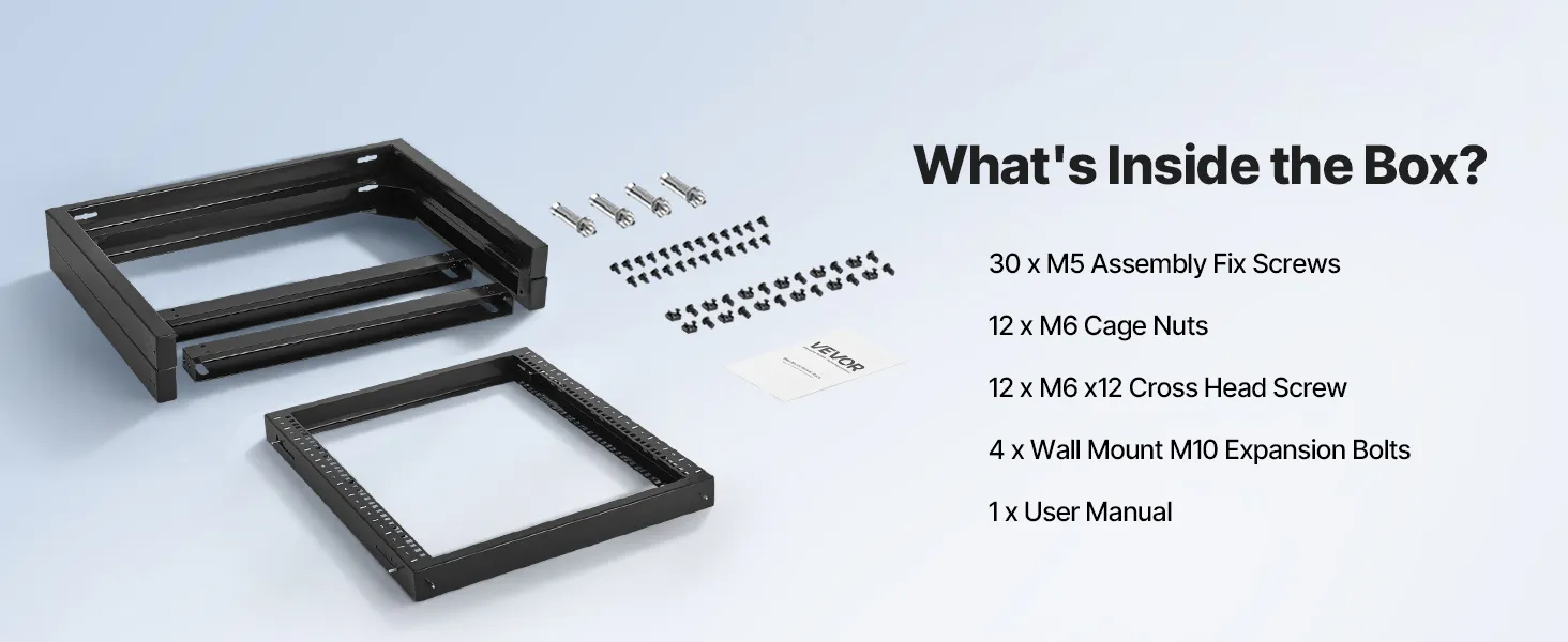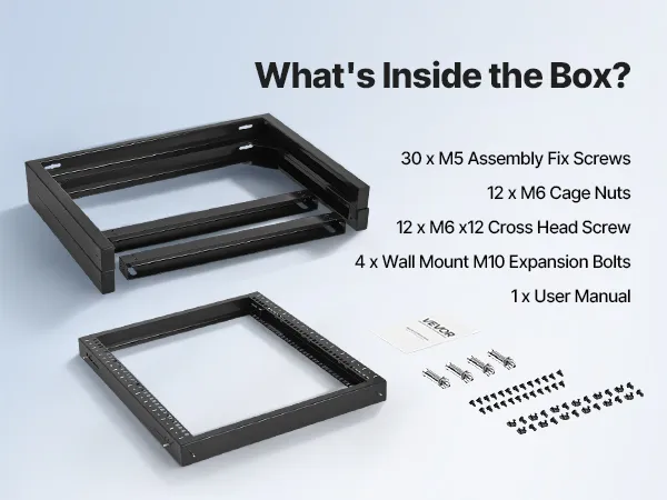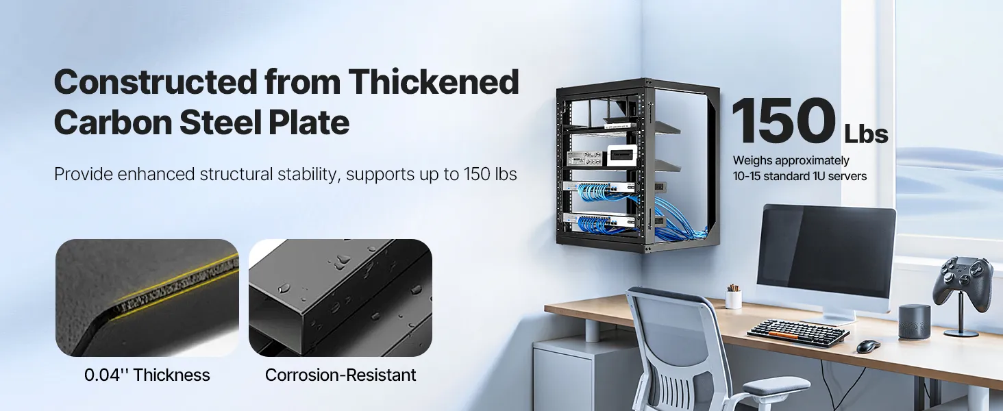 Our network rack features an open hinged door that supports 180° opening. With a solid carbon steel structure, it handles up to 150 lbs (68 kg) to keep your devices stable. With complete accessories, you can securely mount switches or other network devices directly onto the rack!