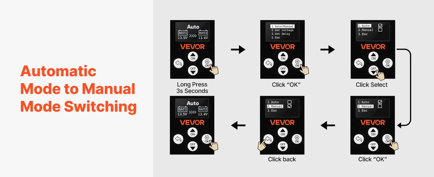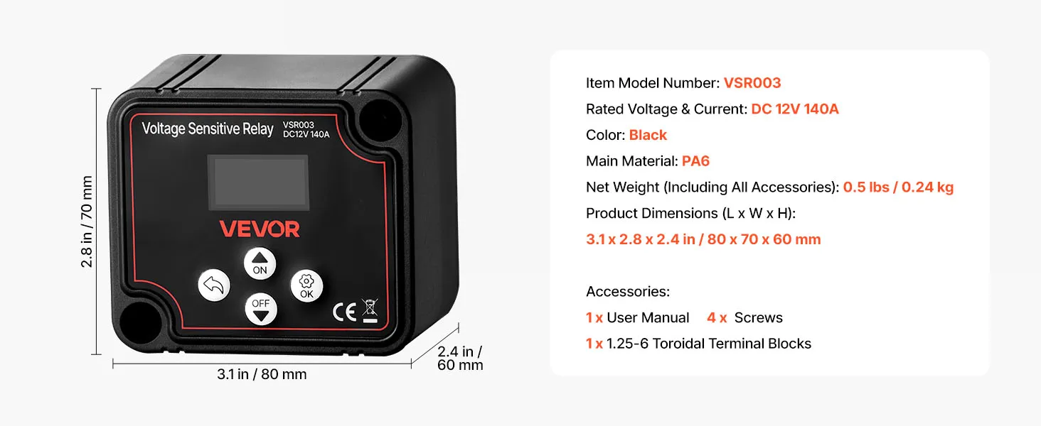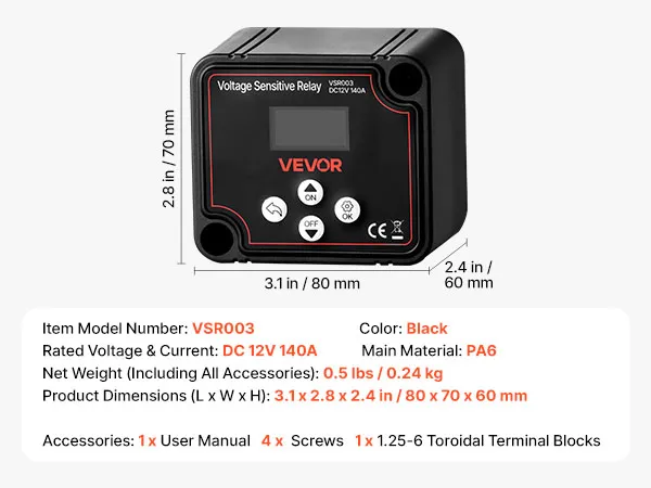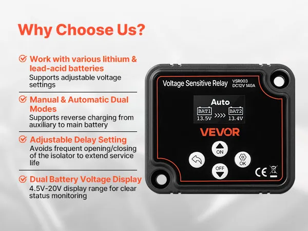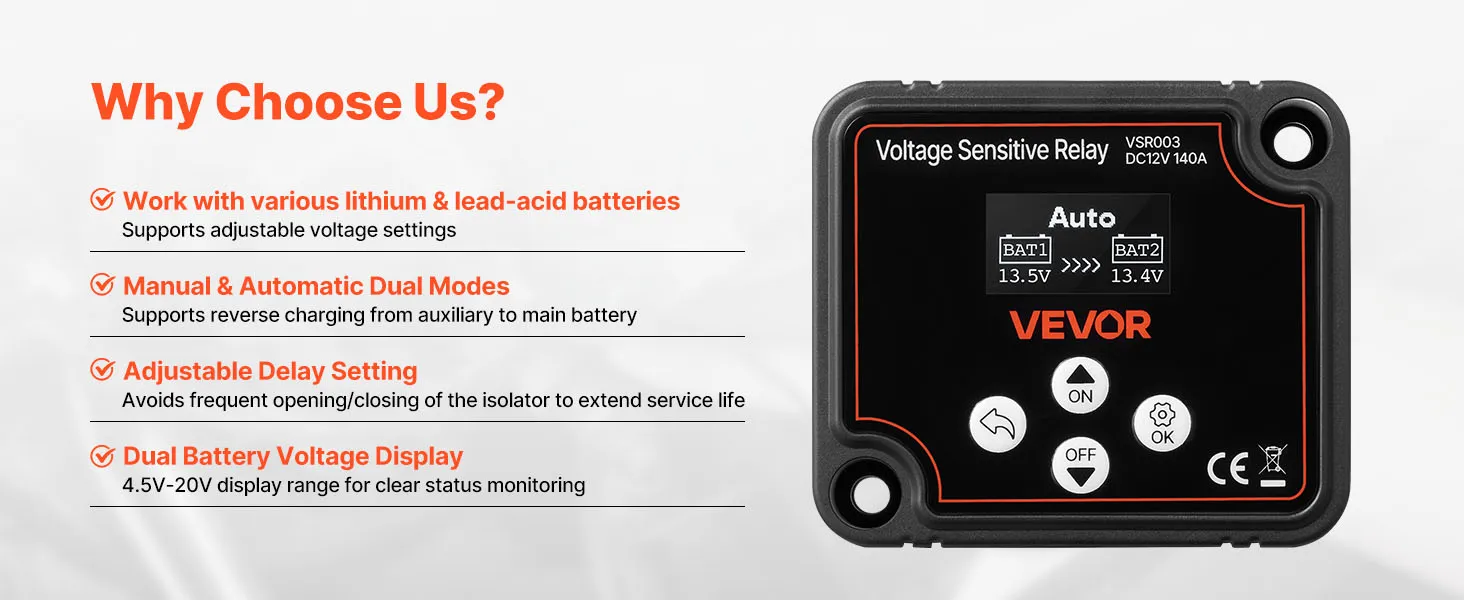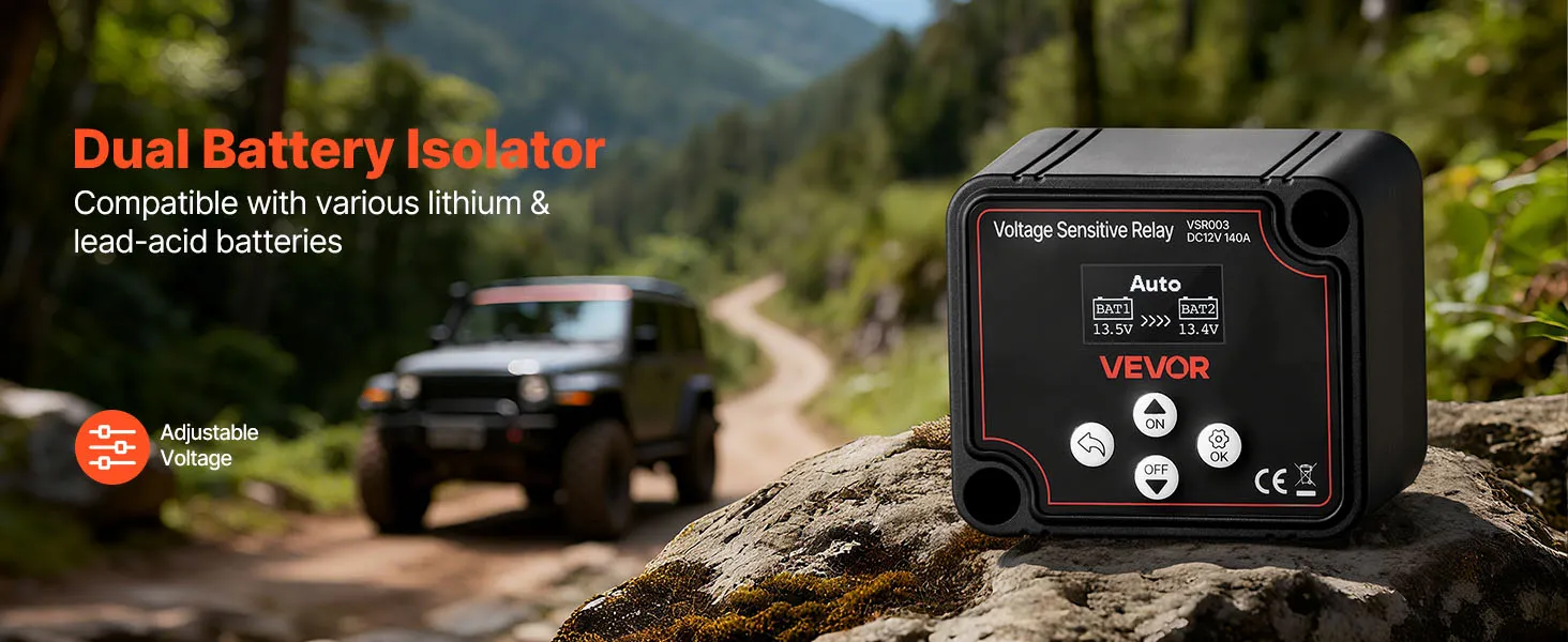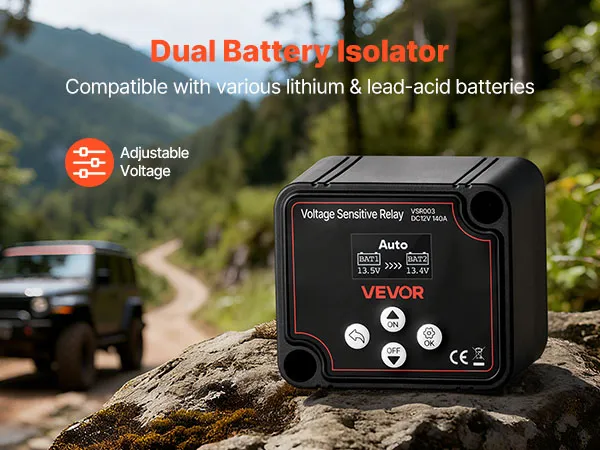 VEVOR Dual Battery Isolator, 12V 140 Amp, Manual and Automatic VSR Voltage Sensitive Relay with LCD Screen, Smart Battery Isolator for Lithium & Lead-Acid Batteries, for Car Truck RV UTV ATV Boat