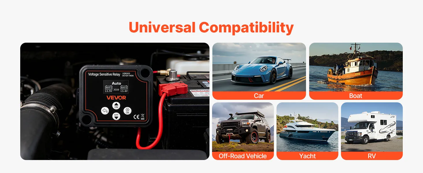 The dual battery isolator automatically adjusts charging voltage according to different battery types. It is widely compatible with various lithium batteries and lead-acid batteries, ensuring that different types of batteries can work efficiently.