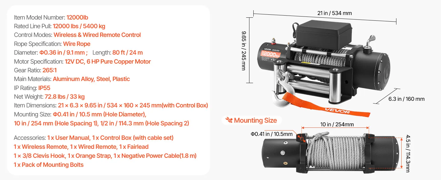 VEVOR Electric Winch, 5400 kg Load Capacity, 12V DC Truck Winch with Φ9.1 mm x 24 m Steel Rope, Wireless & Wired Remote Control, IP55 Waterproof for Towing SUV Jeep Trailer Boat Off-Road Vehicle