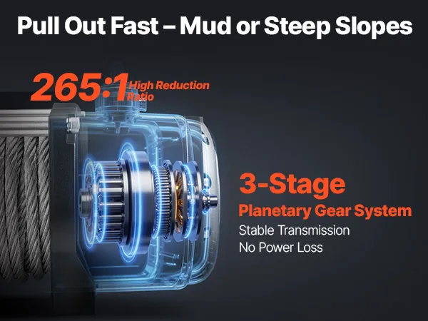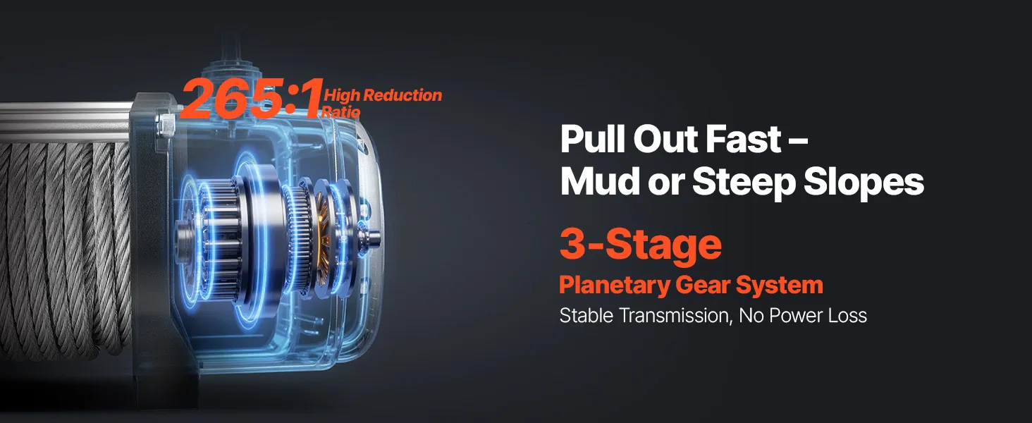 • High-Power Rescue: This 5.5HP motor of the jeep winch with a 265:1 3-stage planetary gear delivers steady pulling force. It runs long hours without overheating, giving you dependable strength for off-road recovery