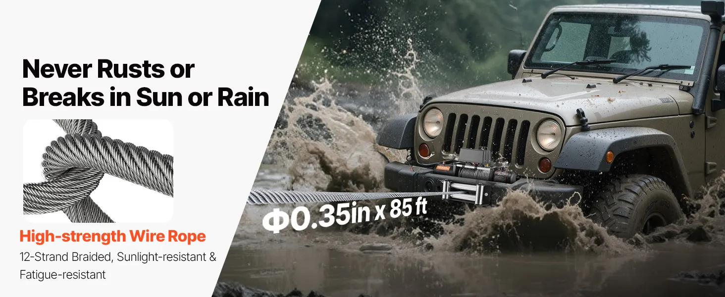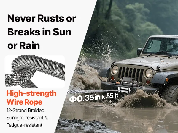 • All-Weather Durable: The 7/20 in x 85 ft 12-strand steel rope resists sunlight, wear, and breakage. With an alloy body, the truck winch stays tough against dust, rain, and harsh terrain