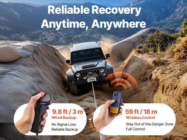 • Secure Remote Control: The 59 ft wireless remote of the winch lets you stay at a secure distance while operating. A 9.8 ft wired remote is included as backup, ideal for mountain trails or areas with weak signals