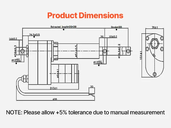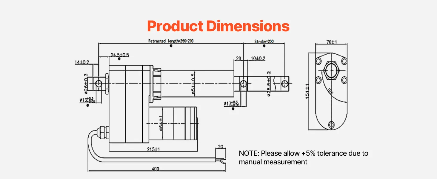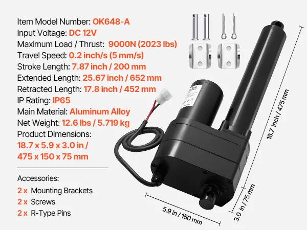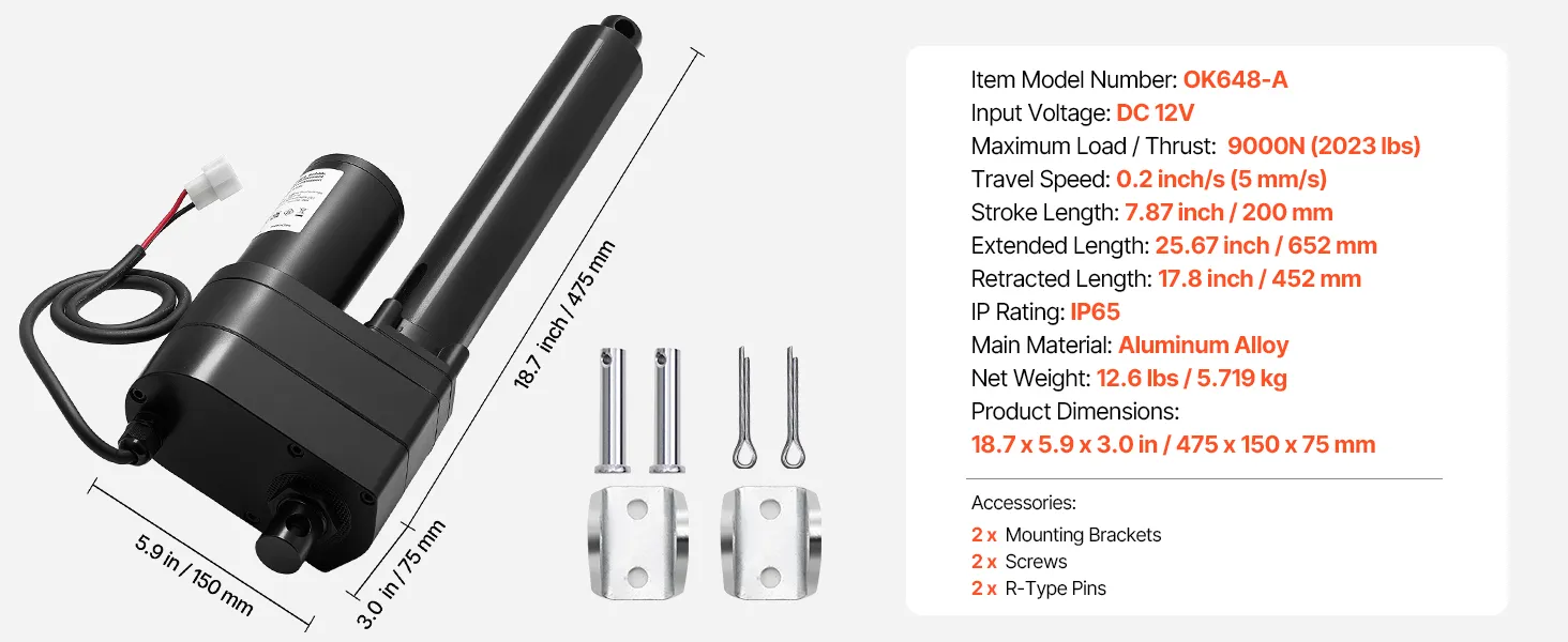 • Key Specifications: Travel Speed: 0.2″/s (5 mm/s); Stroke Length: 7.87″ (200 mm); Extended Length: 25.67″ (652 mm); Retracted Length: 17.8″ (452 mm); Current Draw: 20 Amps; Input Voltage: DC 12V