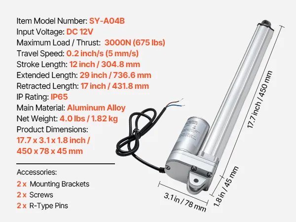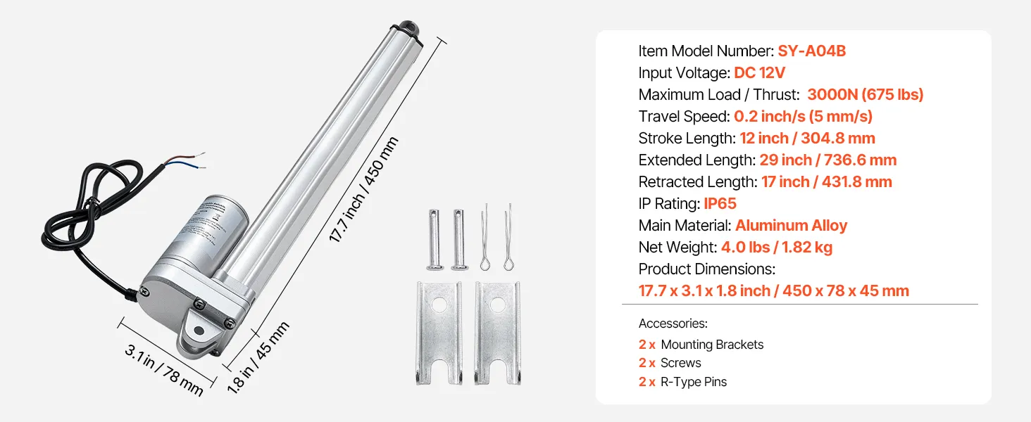 Help you achieve a more efficient and stable automation experience with VEVOR 12V linear actuator, boasting IP65 protection level, 675lbs powerful linear force, and 0.2"/s precise travel speed, ideal for agricultural machinery, industrial use, and more automation applications.