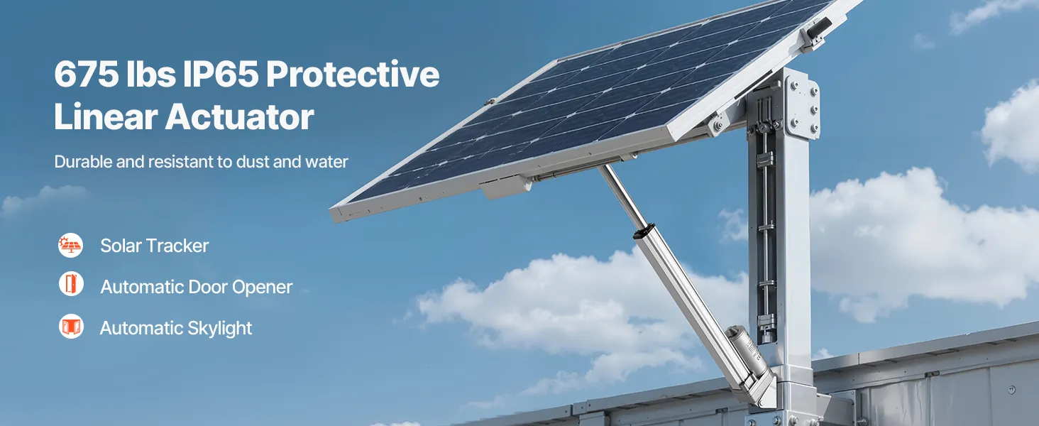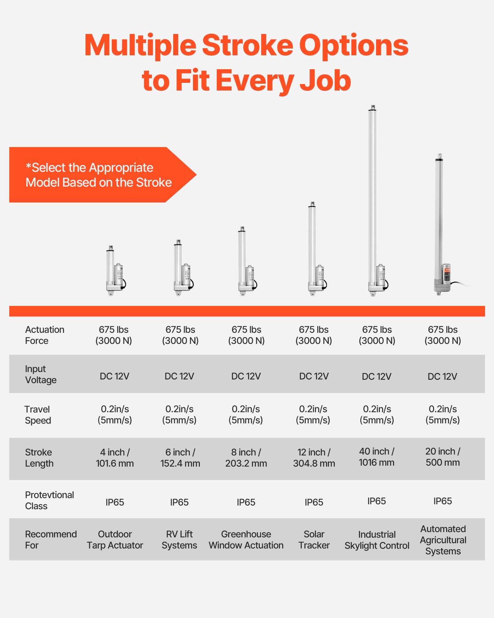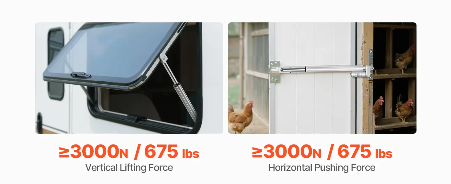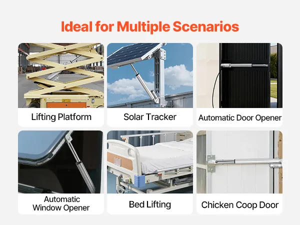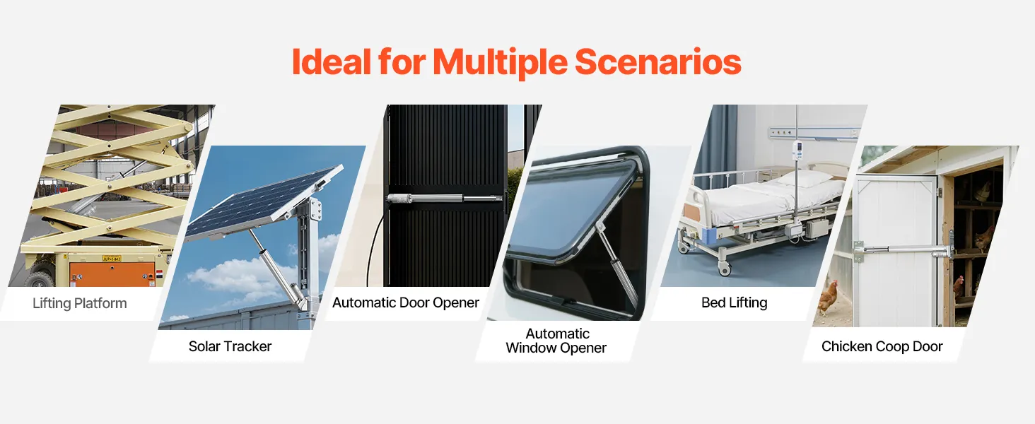 VEVOR 12V linear actuator offers a powerful 675 lbs vertical lifting force and horizontal pushing power, handling various medium-load applications such as solar panel tracking systems, irrigation systems, mechanical equipment, or lawn mowers.