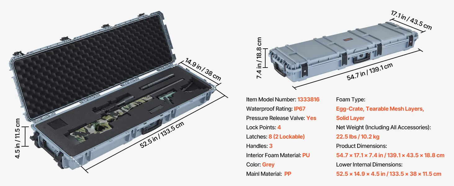 VEVOR Жесткий кейс для винтовки 1320 мм с колесами, IP67 водо- и пылезащитный, замок, поролон, для винтовок и ружей, серый