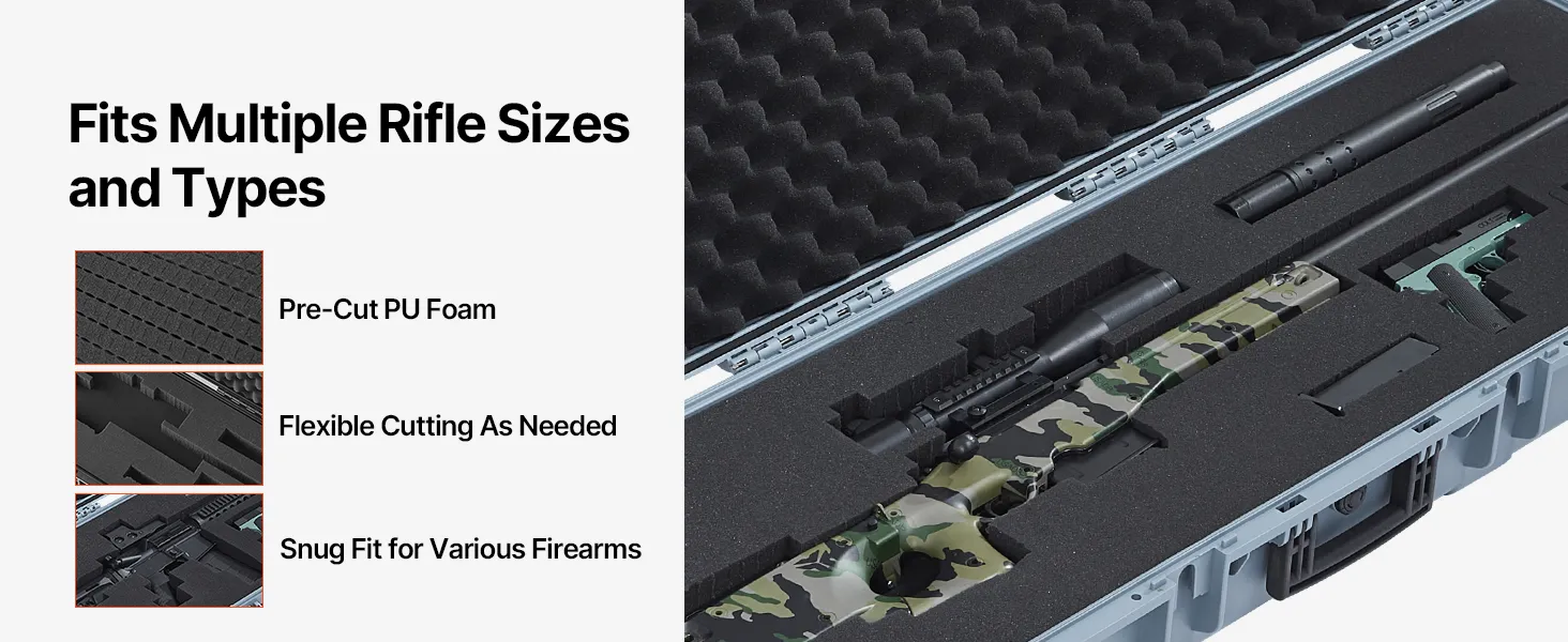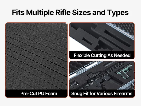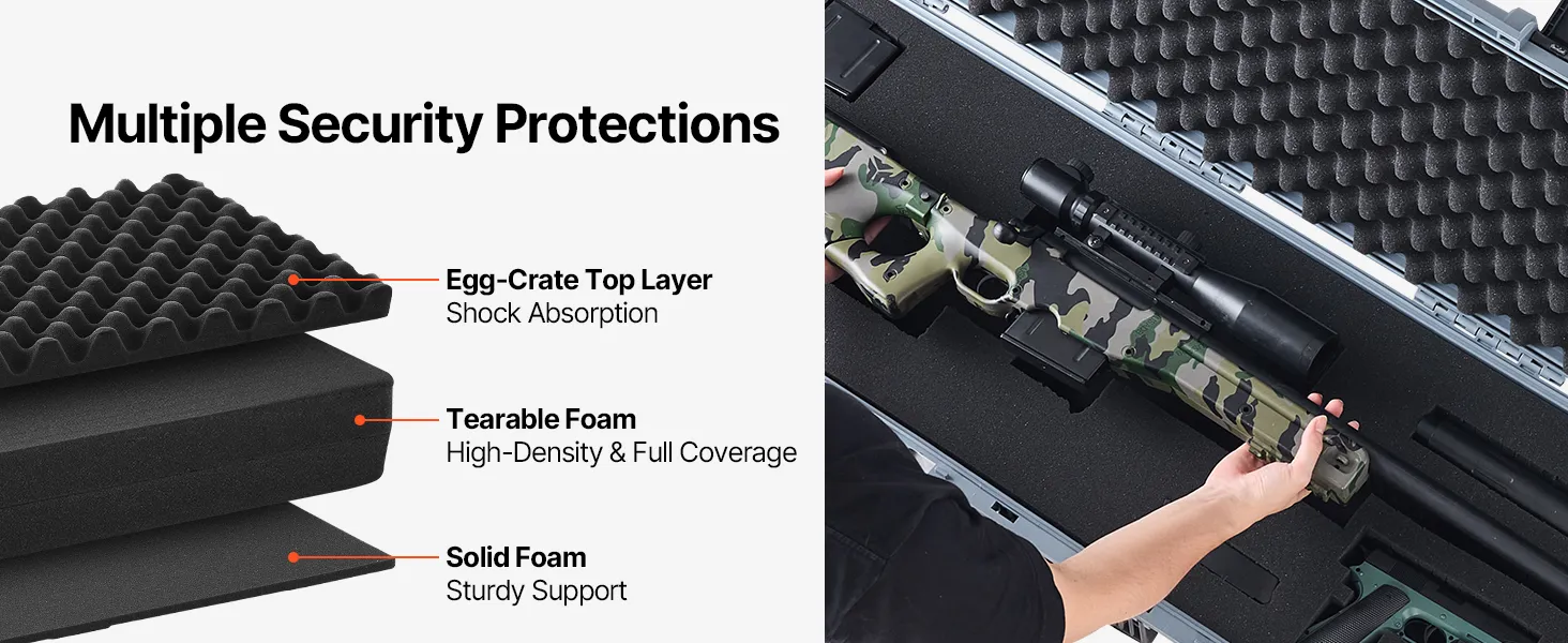 • 4-Layer Foam: Our gun case features 4 layers of soft foam:1 layer of egg-crate foam for shock absorption; 2 layers of pre-cut foam for a snug fit; 1 layer of solid foam for extra support. You can customize compartments tailored to the shapes of your rifle