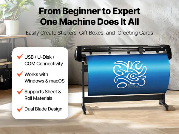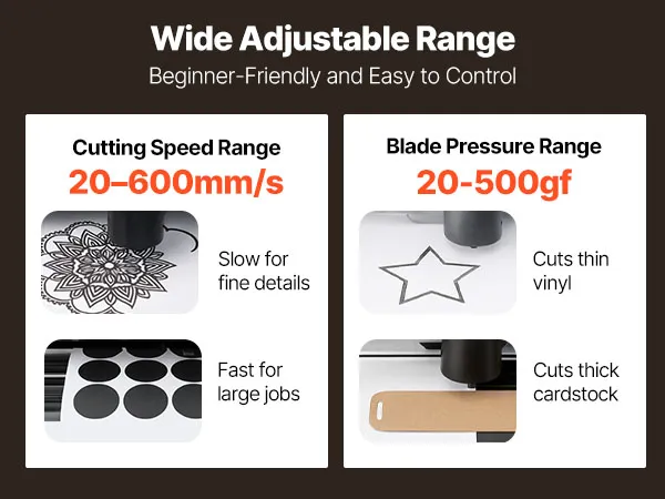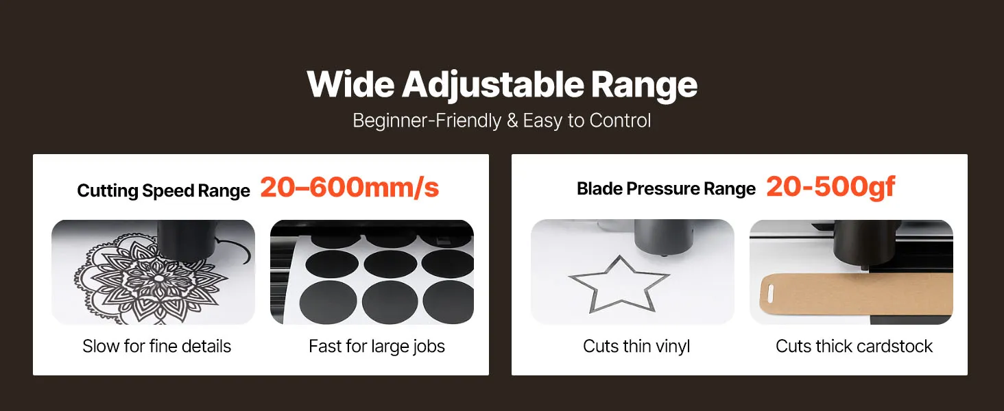 • Material Versatility: This vinyl plotter works with sheets and rolls up to 1 mm thick, with 20–500 gf adjustable force. It easily handles vinyl, HTV, adhesive vinyl, magnetic sheets, sticker paper, car decals, and more for DIY or commercial projects
